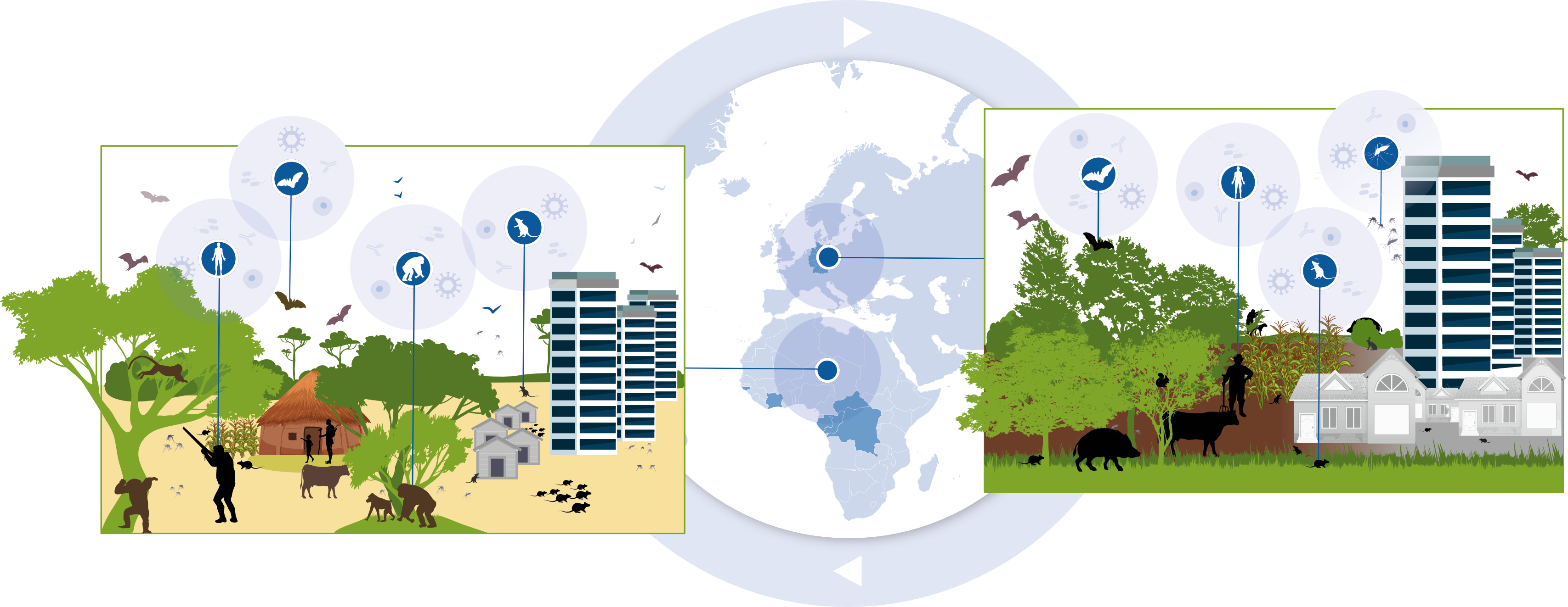 Der Kontakt zwischen Menschen und Tieren wird zunehmend enger. Gründe dafür sind die wachsende Weltbevölkerung, das immer tiefere Eindringen der Menschen in natürliche Lebensräume, die Jagd auf Wildtiere sowie die intensive Viehhaltung und Landwirtschaft. Kombiniert mit Globalisierung, Klimawandel und der erhöhten Mobilität der Menschen sind dies die Hauptursachen für den Ausbruch und die rasche Ausbreitung von Infektionen – das Coronavirus SARS-CoV-2 ist nur ein Beispiel dafür. Neu auftretende oder veränderte Krankheitserreger können sich in kürzester Zeit global verbreiten, Artgrenzen überwinden und zudem Multiresistenzen entwickeln.
