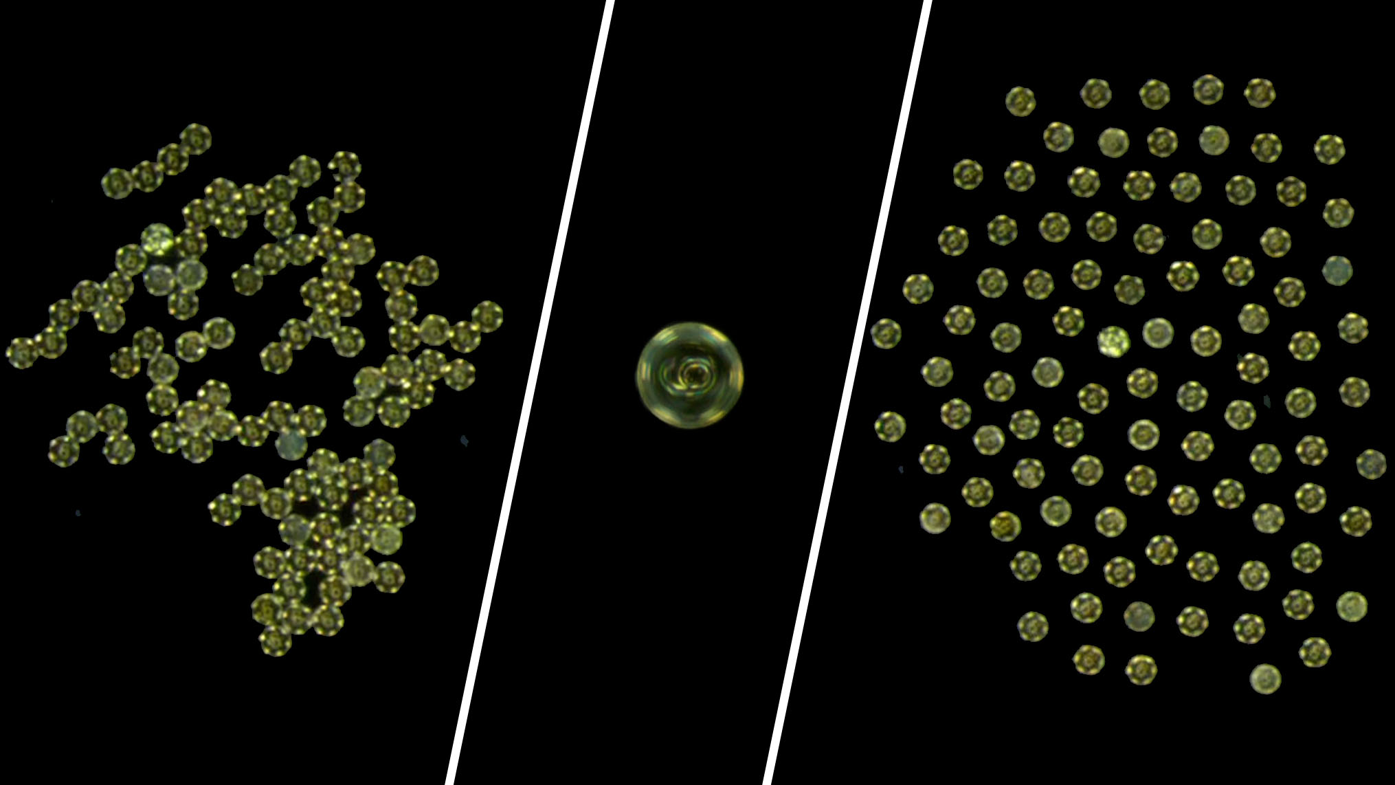 Die Wissenschaftler:innen nutzen alle drei Kräfte, um ein koordiniertes, kollektives Bewegungsmuster von mehreren Dutzend Mikrorobotern innerhalb eines System zu erzeugen. Ein Video zeigt, wie die Roboter durch einen Parkour steuern. Dabei nimmt die Gruppe die Formation an, die am besten passt. Gibt es nur einen schmalen Durchgang, reihen sich die Mikroroboter hintereinander auf, um sich dann wieder auszubreiten, wenn sie herauskommen. Die Wissenschaftler:innen können die Roboter auch tanzen lassen. Außerdem zeigen sie, wie sie eine winzige Plastikkugel in den Wasserbehälter legen und dann die Roboter zu einem Bündel zusammenziehen, um die schwimmende Kugel vor sich herzuschieben. Sie können die winzigen Teilchen auch in zwei Zahnrädern platzieren und die Teilchen so bewegen, dass sie beide Zahnräder zum Drehen bringen. Auch ein geordnetes Muster ist möglich, bei dem jedes Teilchen den gleichen Abstand zu seinem Nachbarn einhält. All diese verschiedenen Fortbewegungsarten und Formationen werden durch externe Rechenleistung ermöglicht: Ein Algorithmus wird programmiert, der ein rotierendes oder oszillierendes Magnetfeld erzeugt, das wiederum die gewünschte Bewegung und Rekonfigurierung auslöst.