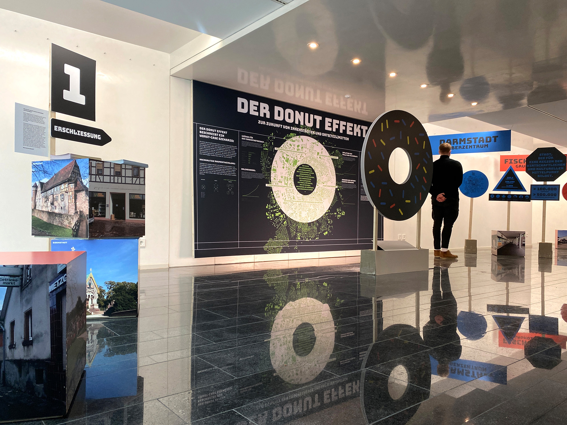 Für die Ausstellung „Der Donut-Effekt – Zur Zukunft von Innenstädten und Orts(teil)mitten“ haben sich Studierende aus den Studiengängen Architektur, Bau- und Umweltingenieurwesen und Wirtschaft Gedanken zur Gestaltungen neuer Mitten gemacht. In insgesamt mehr als 40 Arbeiten beschäftigen sie sich mit Themen wie Klimaanpassung, Stadt der kurzen Wege, Einkaufen, Wohnen und Freizeit, der Gestaltung des öffentlichen Raums sowie alternativer Mobilität. Ziel der Ausstellung ist es, neue Impulse für eine nachhaltige Stadtentwicklung zu geben und den Austausch mit kommunalen Akteurinnen und Akteuren anzustoßen.