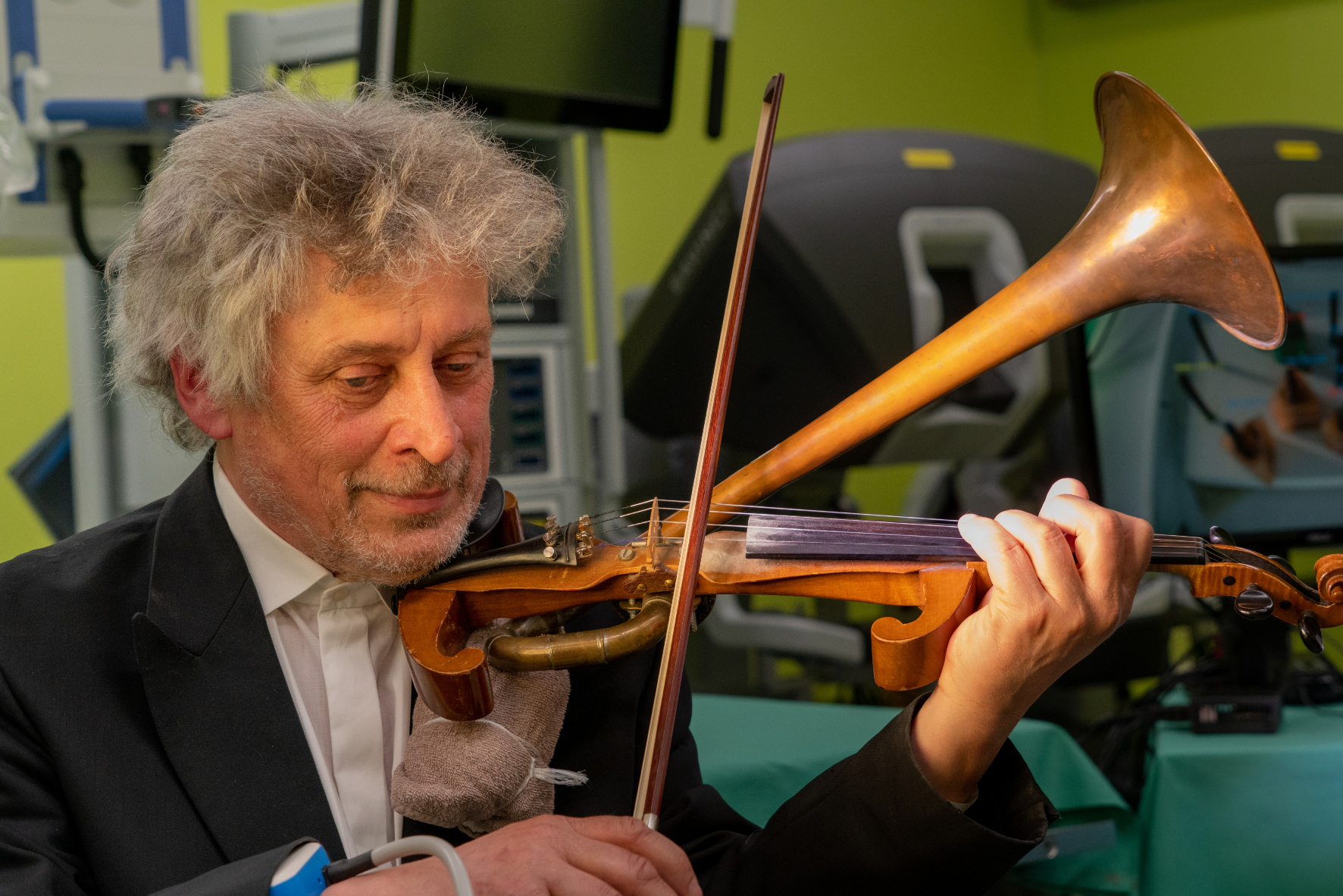 BU: Henry Schneider musiziert im Experimental-OP auf der Trompetengeige. © Uniklinikum Dresden/Kirsten Lassig