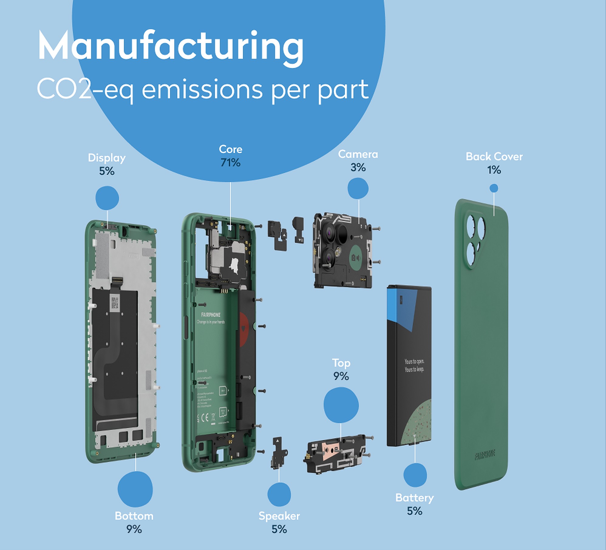 Den Gesamtbeitrag des Geräts zur globalen Erwärmung schätzen die Forschenden auf 43 Kilogramm CO2-Äquivalente und damit um vier Kilogramm höher als beim Vorgängermodell Fairphone 3. Dieser Unterschied lässt sich vor allem auf die erweiterte Funktionalität des neuen Modells ebenso wie einen höheren Anteil des Lufttransports und die Halbleiter-Krise zurückführen. Erstmals wurden im Rahmen des Reports auch die Ökobilanzen des zusätzlichen Zubehörs des Telefons, also Kopfhörer, Schutzhüllen und ein Schraubenzieher, analysiert.
