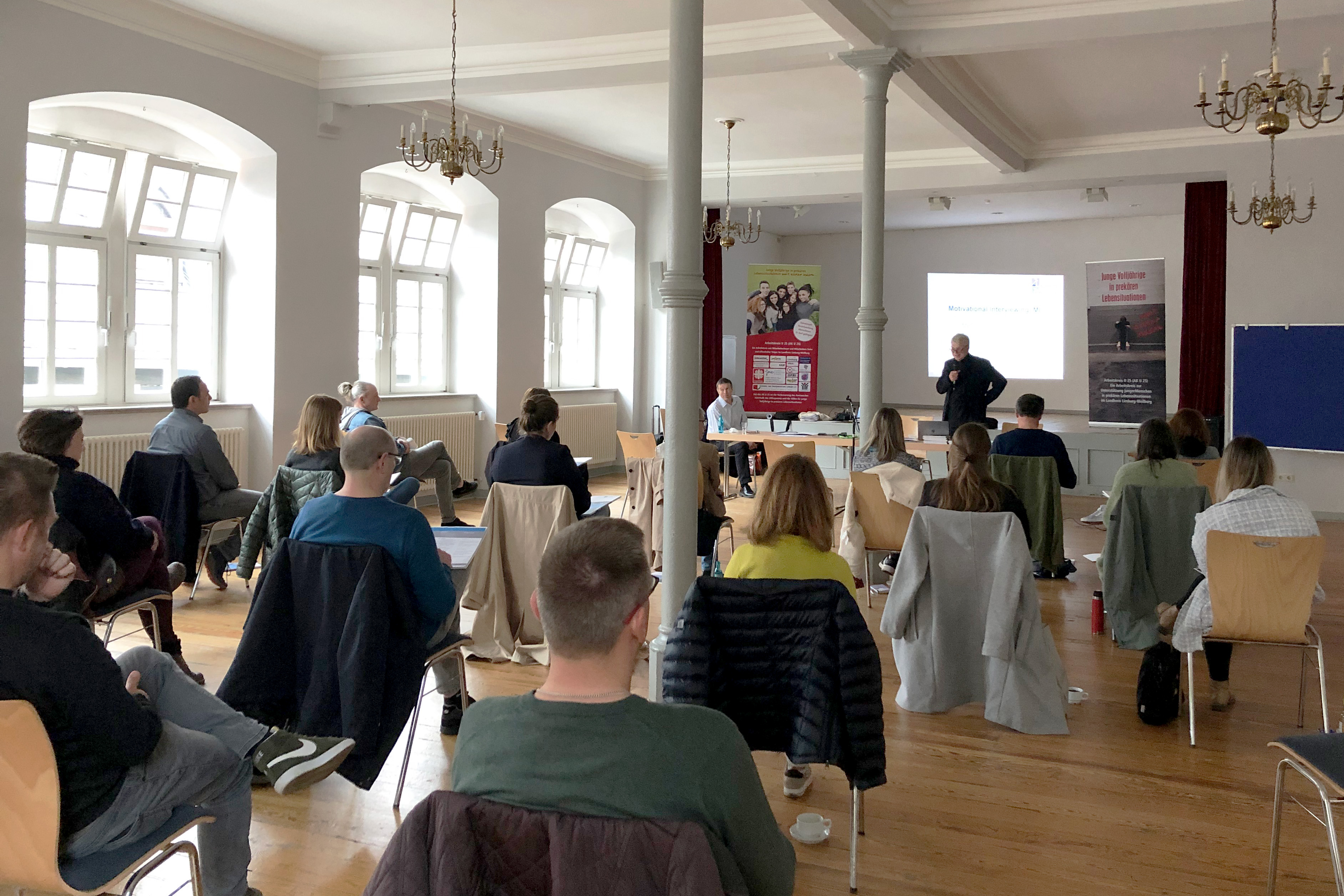 Inhaltlicher Schwerpunkt des Fachtags waren neue methodische Konzepte zur Ressourcenaktivierung und Resilienzförderung bei Jugendlichen in spezifischen Problemlagen. Viele dieser jungen Menschen haben Erfahrungen von Armut, Gewalt, Drogen und kritischen Lebensereignissen wie etwa Tod oder gravierende Erkrankungen von Bezugspersonen gemacht, aus denen sich ohne professionelle Hilfen weitere vielschichtige Folgeprobleme entwickeln. Prof. Dr. Frietsch, Dirk Holbach M.A. und Corinna Leißling M.Sc. vom IFW stellten den Fachkräften ausgewählte Methoden und Instrumente zur Bearbeitung spezifischer Problemlagen sowie eine entsprechende Entwicklungs- und Hilfeplanung vor. Im Rollenspiel übten die Teilnehmenden unter anderem die Methode der „Motivierenden Gesprächsführung“ nach Miller und Rollnick ein, um bei den betroffenen Jugendlichen die Selbstwirksamkeit bei der Ressourcenaktivierung zu stärken und so das Verhalten nachhaltig zu verändern. Die Tagung bot zudem viel Raum für den fachlichen Diskurs über die Anwendung und Praxistauglichkeit der Instrumente in den unterschiedlichen Hilfeeinrichtungen für Jugendliche.