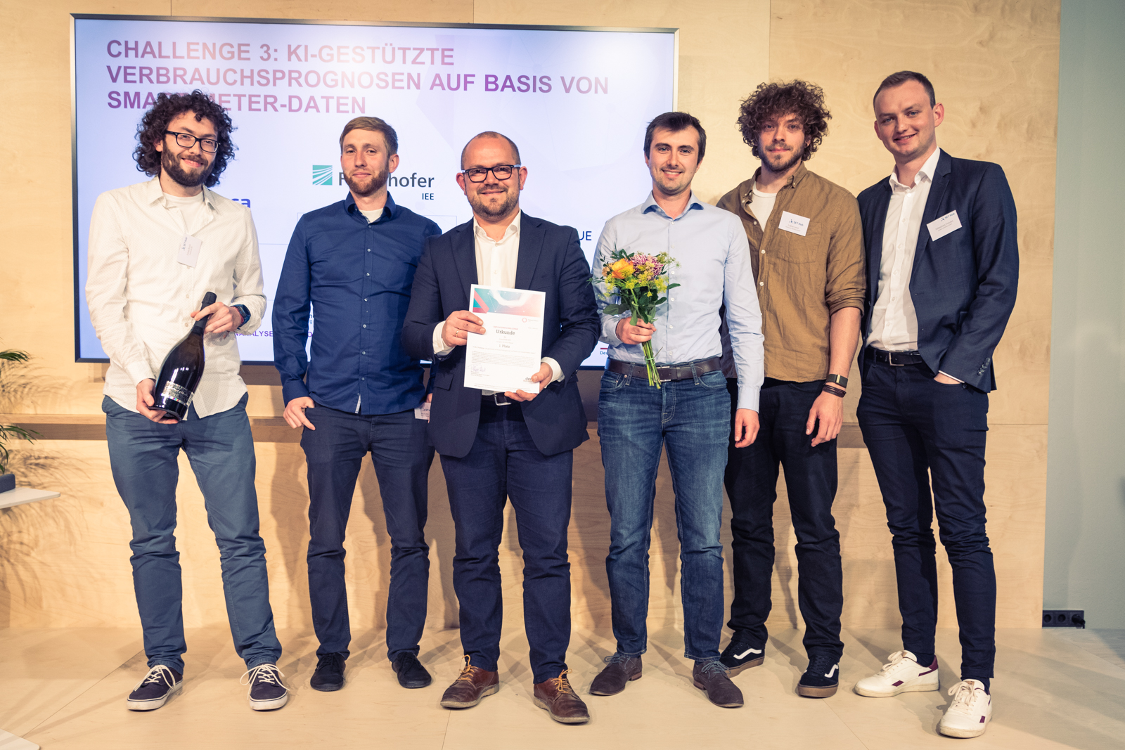 Die Wissenschaftler Dominik Jost, Jonas Koch und Dominik Beinert des Fraunhofer-Instituts für Energiewirtschaft und Energiesystemtechnik IEE haben die Data4Grid-Challenge „KI-Gestützte Verbrauchsprognosen auf Basis von Smart-Meter-Daten“ gewonnen. Der Wettbewerb wurde von der Deutschen Energie Agentur (dena) und umlaut ausgerichtet. Die Präsentation der Ergebnisse und Siegerehrung fand am vierten Mai 2022 im Future Energy Lab in Berlin statt.