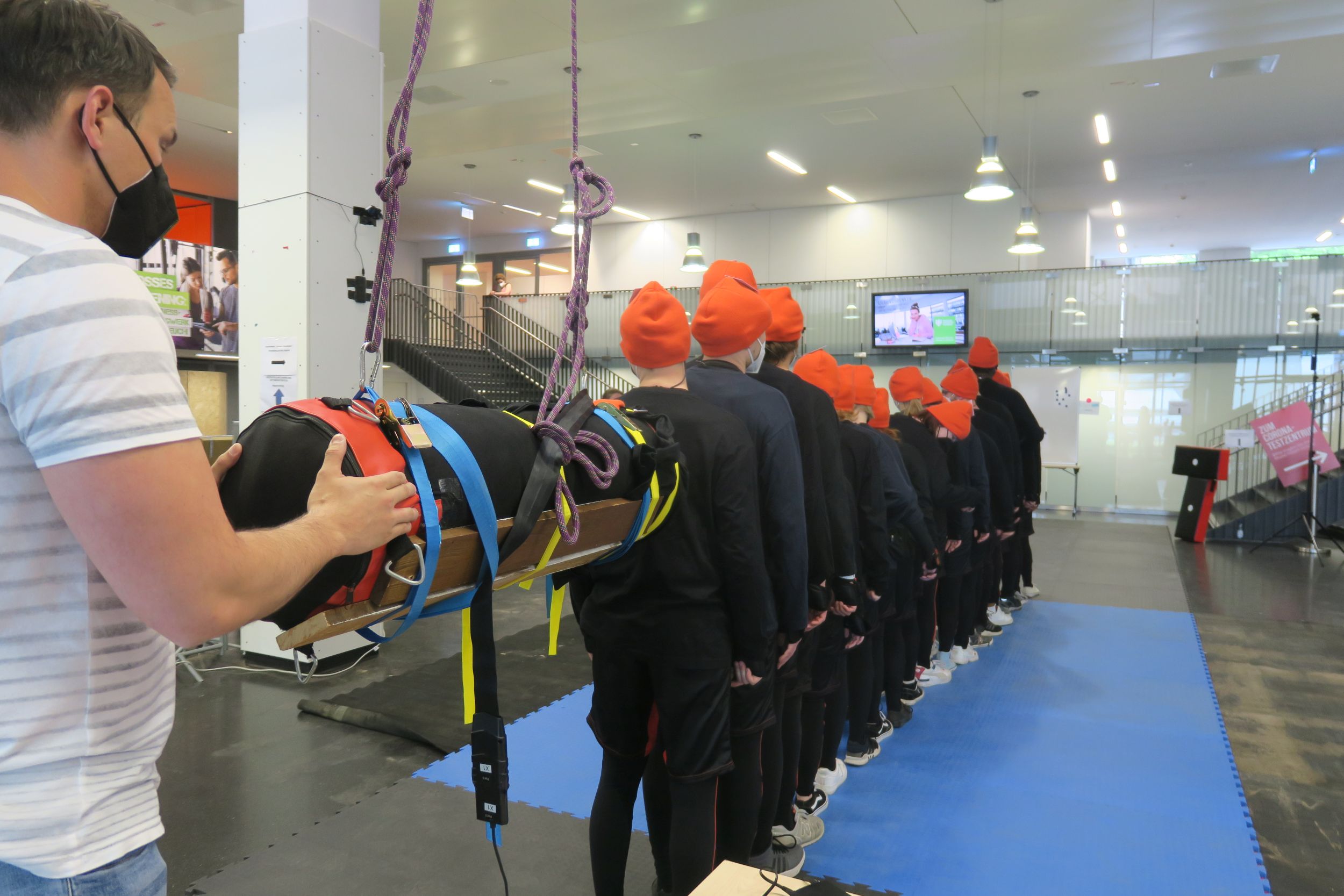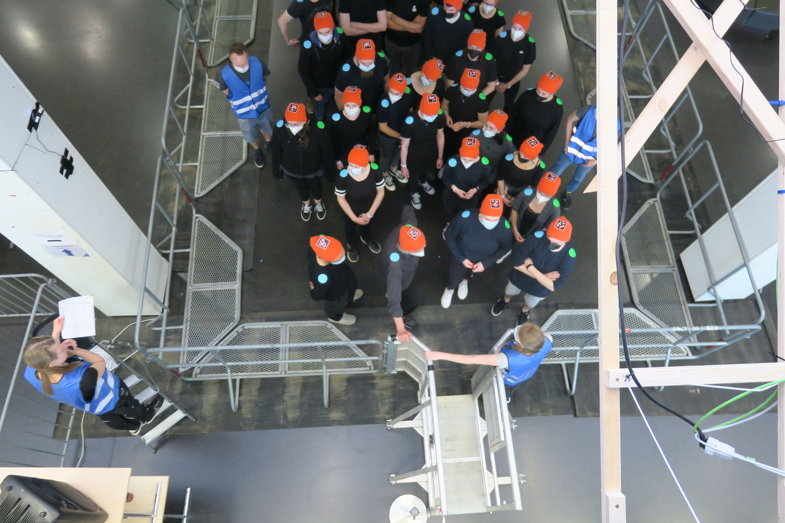 Die Versuchsteilnehmer:innen müssen sich beispielsweise in Gruppen durch einen Einlass zwängen, sind plötzlichen Schubsern beim Schlangestehen ausgesetzt oder treffen in verschiedenen Konstellationen aufeinander. Die Forscher:innen wollen so einen tiefen Einblick in die physikalischen Kräfte gewinnen, die auf die Proband:innen wirken. Und sie wollen neue Erkenntnisse über die Ausbreitung von Informationen inmitten einer Menschenmenge erlangen, wie Menschen untereinander kommunizieren, in welche Richtung sie Informationen weitergegeben. Videoanalysen und spezielle Monturen zur Bewegungsmessung, Xsens-3D-Motion-Tracking-Anzüge, liefern dabei umfangreiche Daten, um ein hochaufgelöstes Bild des dynamischen Geschehens zu erfassen: Welche Körperstellen kommen in Kontakt? Wie breiten sich Schubser in einer Menge aus? Und wie wirken sich die Stärke des Stoßes, die Anordnung der Proband:innen und der Abstand zwischen den Personen auf das Körpergleichgewicht und damit auf das Sturzrisiko aus?