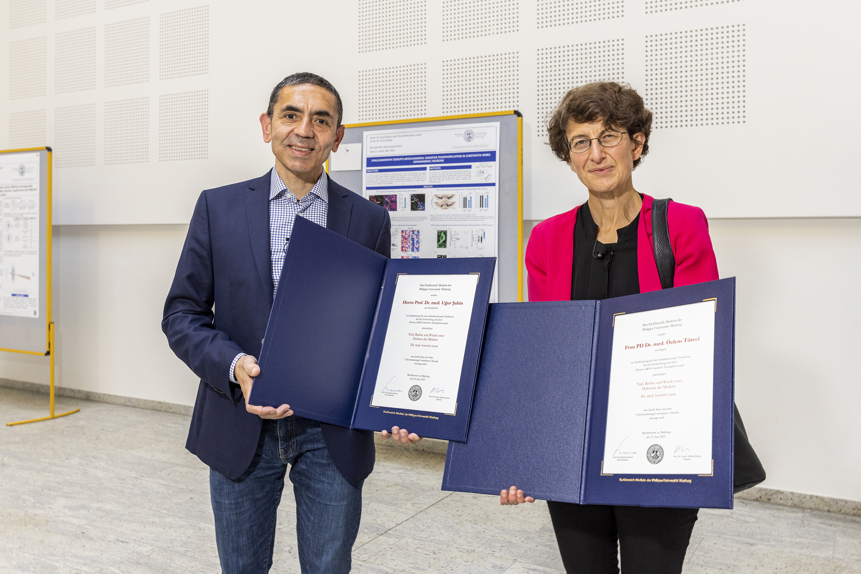 In feierlichem Rahmen haben die Dekanin des Fachbereich Medizin, Prof. Dr. Denise Hilfiker-Kleiner und der Präsident der Philipps Universität Marburg, Prof. Dr. Thomas Nauss Özlem Türeci und Uğur Şahin die Urkunden für die Ehrendoktorwürde des Fachbereichs Medizin im Auditorium des Universitätsklinikums überreicht.