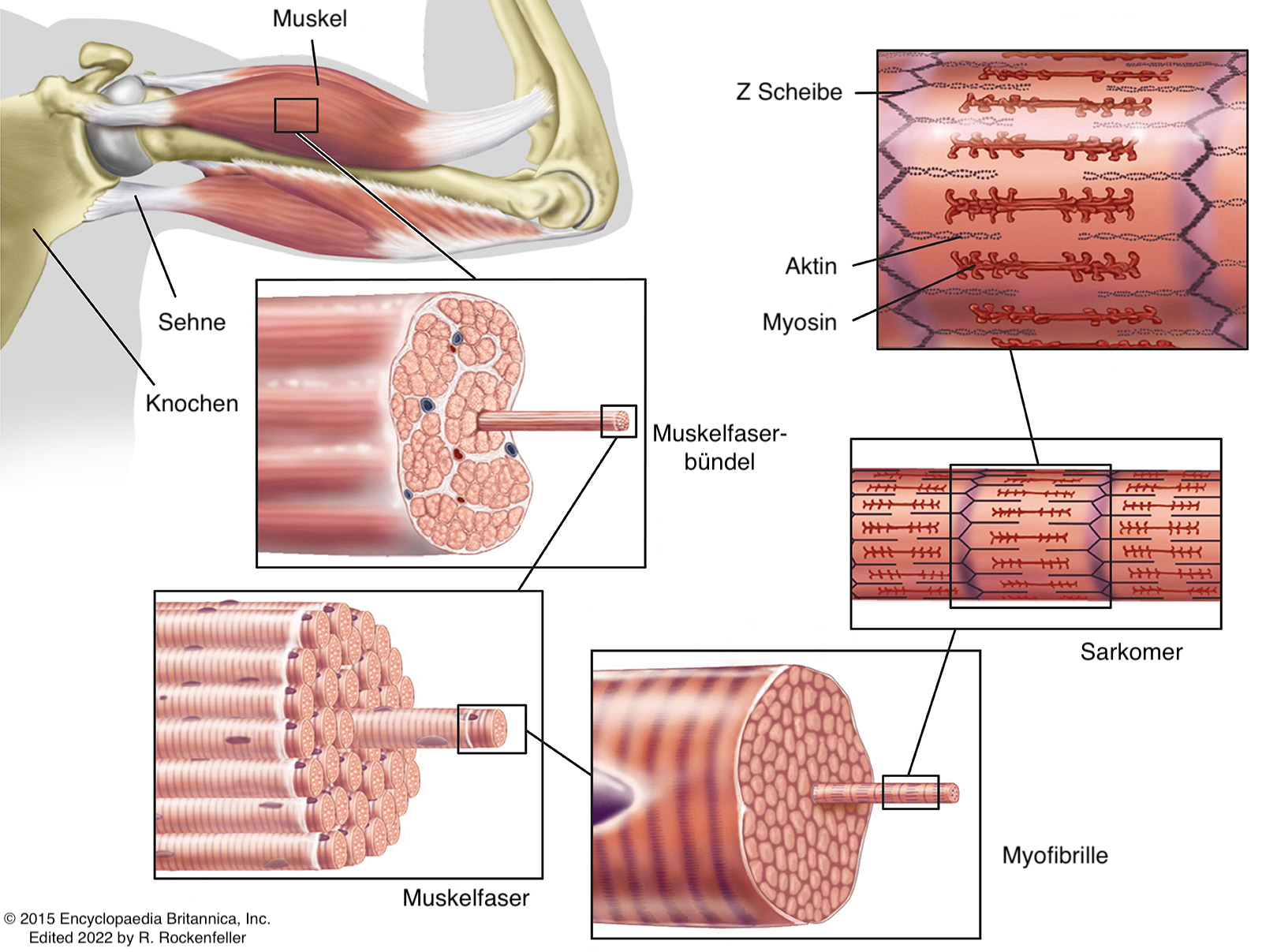 Ein Muskel wie etwa der Bizeps besteht aus zehntausenden von Muskelfasern der Dicke eines Haares, die wiederum aus tausenden der kleinsten Muskeleinheiten zusammengesetzt sind: den Sarkomeren. Sobald das zentrale Nervensystem den Anstoß zu einer bestimmten Bewegung gibt, wird durch das zentrale Nervensystem ein elektrischer Reiz gesendet. Dieser trifft auf die Muskelzelle und veranlasst die Ausschüttung von Calcium-Ionen in die Sarkomere: Die Muskelzelle und damit ein Teil des Muskels wird aktiviert. Dies führt zu einer Kraft-aktiven Querverbindung der gegenläufigen fadenähnlichen Strukturen Aktin und Myosin. Myosin besitzt Proteinausstülpungen, die sich wie eine Menge untereinander unabgestimmt arbeitender Tauzieher am seilartigen Aktin entlanghangeln, dadurch Kraft erzeugen und so vereint eine Zugkraft an jedem Ende des Muskels erzeugen, die immer auf seine Verkürzung hinarbeitet. Als Treibstoff nutzen sie hierfür das vom Körper in großen Mengen synthetisierte Molekül Adenosintriphosphat (ATP).