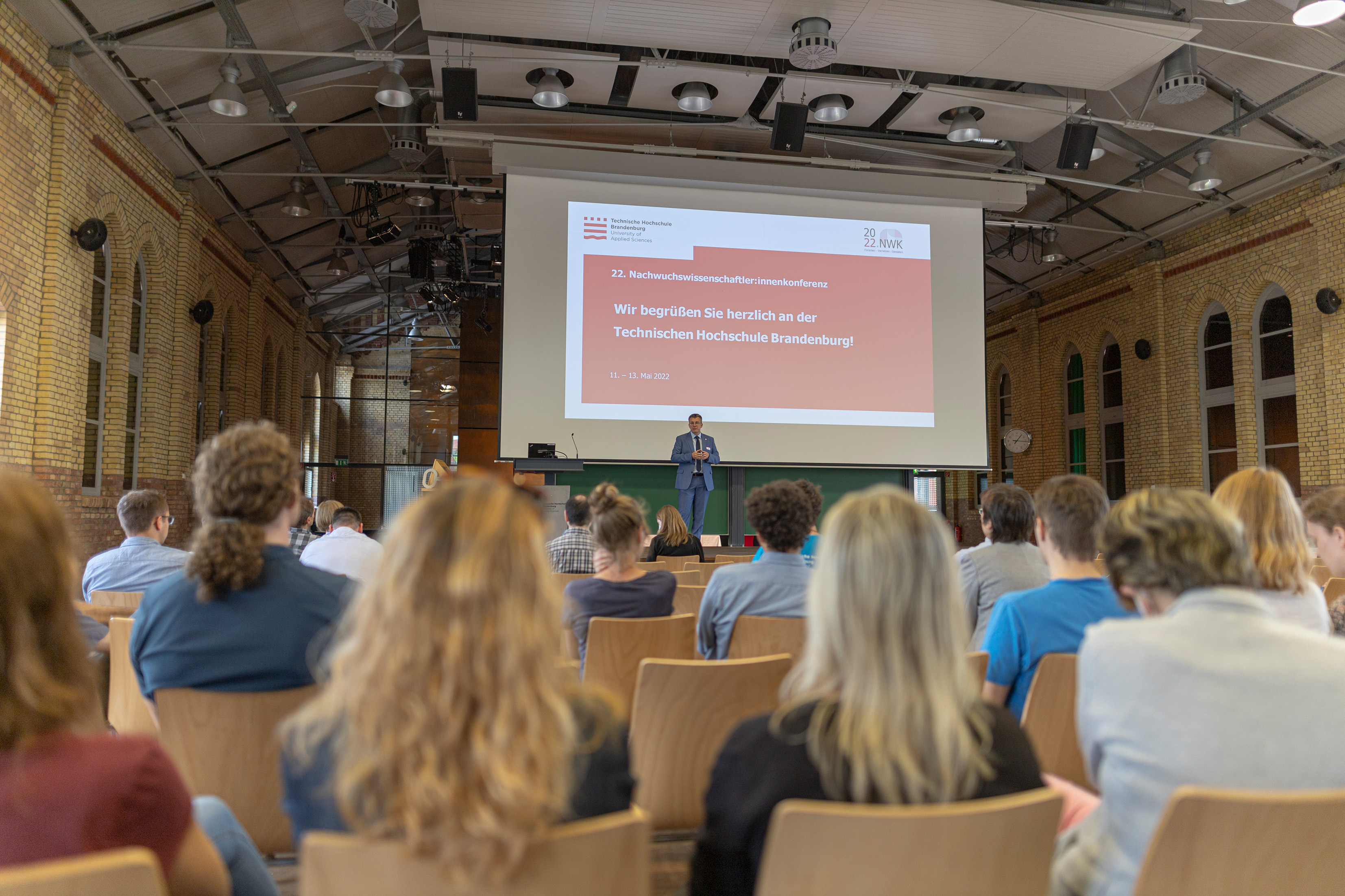 „Forschen – Vernetzen – Gestalten“: Am Mittwochnachmittag wurde im Audimax der Technischen Hochschule Brandenburg die 22. Nachwuchswissenschaftler:innenkonferenz (NWK) eröffnet. Bei der Fachkonferenz werden insgesamt rund 80 Beiträge der angewandten Forschung von Masterstudierenden, Promovierenden sowie jungen Wissenschaftlerinnen und Wissenschaftlern aus ganz Deutschland präsentiert.