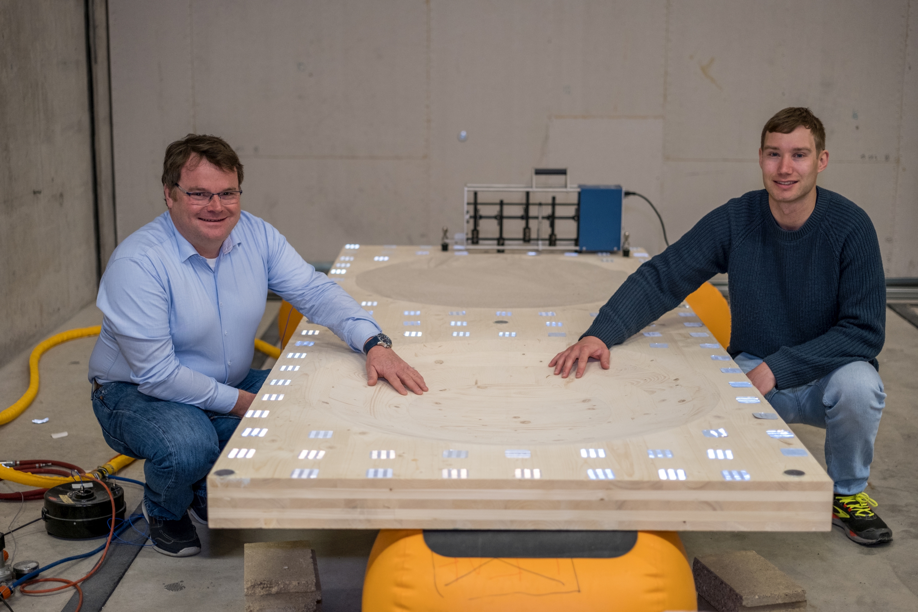 Allerdings ist die Fertigung bei sehr dünnen, harten Materialien nicht einfach. Weder im Holzbau noch in der Bauakustik fanden je Experimente mit Mironovs Aussparungen statt. Dies ändert Laborleiter Stefan Schoenwald nun gemeinsam mit seinem Kollegen Sven Vallely. Mit neuartigen Brettsperrholzplatten-Elementen wollen die beiden Forscher die Trittschalldämmung im Holzbau verbessern.