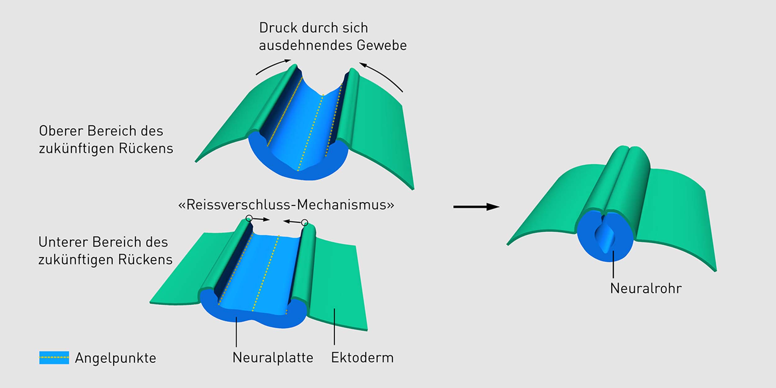 Die ETH-Forschenden postulieren nun einen alternativen Mechanismus, wonach sich die Neuralplatte nicht aktiv selbst und getrieben durch die Angelpunkte zu einem Rohr verbiegt. Vielmehr nimmt die Neuralplatte zunächst aus anatomischen Gründen eine leicht gewölbte Form ein. Anschliessend dehnt sich das auf beiden Seiten der Neuralplatte liegende Gewebe (Ektoderm und Mesoderm) aus. Dieses drückt von der Seite auf die Neuralplatte und bewirkt, dass sie sich passiv zu einem Rohr formt.