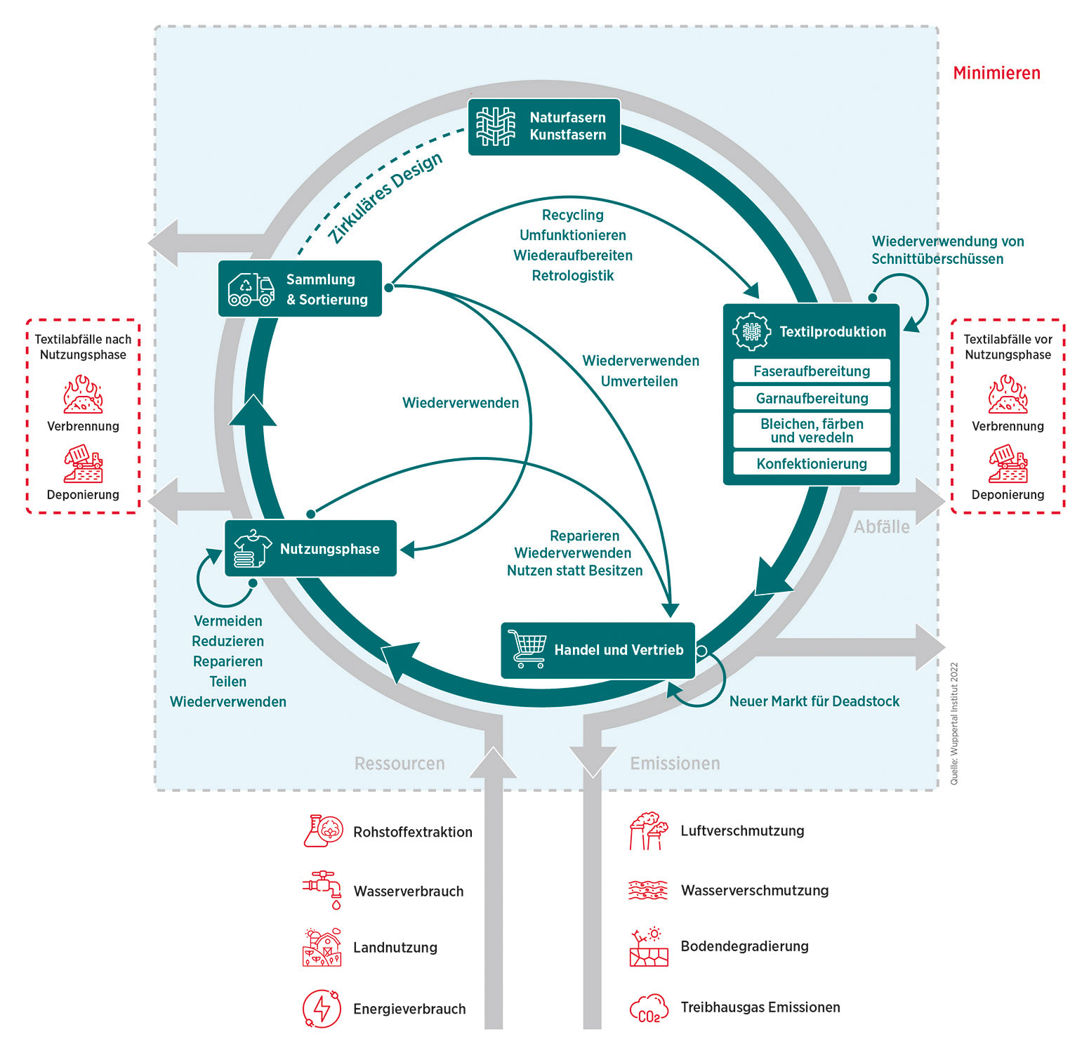Dieses Problem ist auf die bislang linear gestaltete Wertschöpfungskette zurückzuführen. Daher ist eine ganzheitliche Transformation notwendig, wie der Zukunftsimpuls „Die Kreislaufwirtschaft als neues Narrativ für die Textilindustrie“ des Wuppertal Instituts veranschaulicht. Die Autor*innen analysieren die textilen Wertschöpfungsketten mit Blick auf Deutschlands Chancen einer kreislaufwirtschaftlichen Transformation. Nach ihrer Ansicht sollte beispielsweise mithilfe von Pilotprojekten das bestehende Sammel- und Sortiersystem in Deutschland zu einer flächendeckenden Erfassung und qualitätssichernden Wiederverwendung ausgebaut werden. In dem Papier verdeutlichen sie daher, dass der Weg aus der Konsum- und Wegwerfgesellschaft – auch „take, make, dispose“ genannt – hin zu geschlossenen und ressourceneffizienten Kreisläufen nur gelingt, wenn Textilabfälle minimiert und Rohstoffe in das System zurückgeführt werden. Dies ließe sich auch mit ökonomischen Anreizen, wiederaufbereiteten oder umfunktionierten Textilien – beispielsweise Taschen aus Bettlaken –, mit Reparatur-Services oder den Kauf von Secondhand-Kleidung erreichen. Damit der Ausstieg aus der immer maßloseren „Fast Fashion“ gelingt, stellt Dr. Henning Wilts, Leiter der Abteilung Kreislaufwirtschaft am Wuppertal Institut, heraus: „Eine Roadmap zur Kreislaufwirtschaft der Textilindustrie in Deutschland muss in ein konsistentes Gesamtkonzept integriert sein und die Vorgaben der Textilstrategie umfassen. Sie soll Grundlagen für die Umsetzung liefern und gleichzeitig helfen, Deutschland als Vorreiter der zirkulären Textilwirtschaft zu positionieren.“