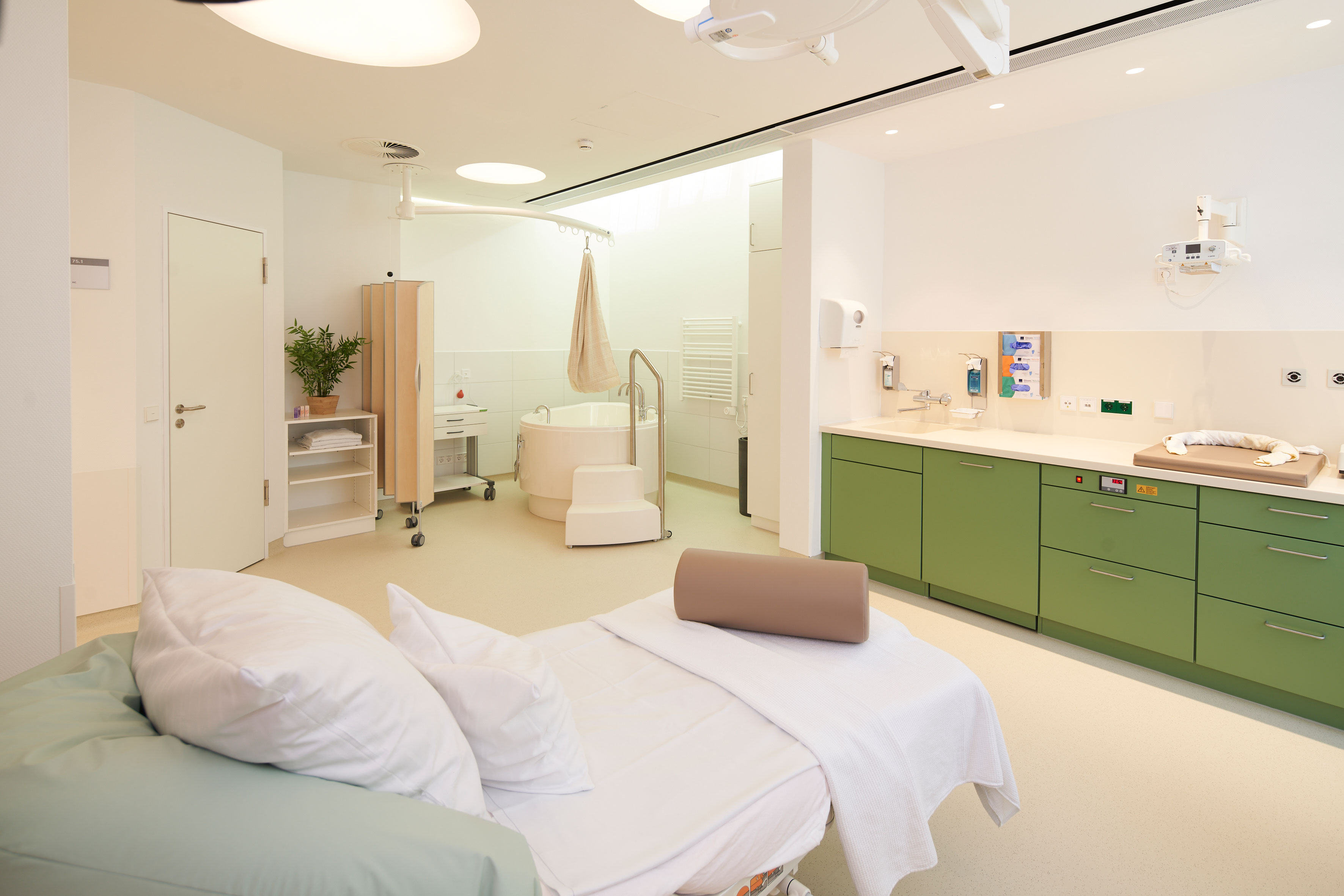 Des Weiteren wurden auch geburtshilfliche Konzepte mitgedacht, die zunehmend an Bedeutung gewinnen und die das Team der Frauenklinik schon jetzt fördern möchte. Die neue Struktur unterstützt etwa den „Hebammen-geleiteten Kreißsaal“. „Dieses Angebot richtet sich künftig an Frauen, die keine relevanten geburtshilflichen Risiken zu erwarten haben und sich eine möglichst interventionsarme Geburt wünschen“, erklärt Professor Reister. Wie der Name schon sagt, werden die Entbindungen im Hebammen-geleiteten Kreißsaal primär ausschließlich durch Geburtshelferinnen begleitet. Sollte während der Geburt ärztliche Unterstützung benötigt werden, sind die Kolleginnen und Kollegen dank kurzer Wege schnell vor Ort. „Dieses Projekt ist aktuell noch in der Entwicklung, aber die renovierten Räume bilden die nötigen Voraussetzungen bereits ab“, so Professor Reister. „Damit möchten wir den Wunsch einer möglichst natürlichen Geburt erfüllen und gleichzeitig die höchstmögliche Sicherheit bieten.“