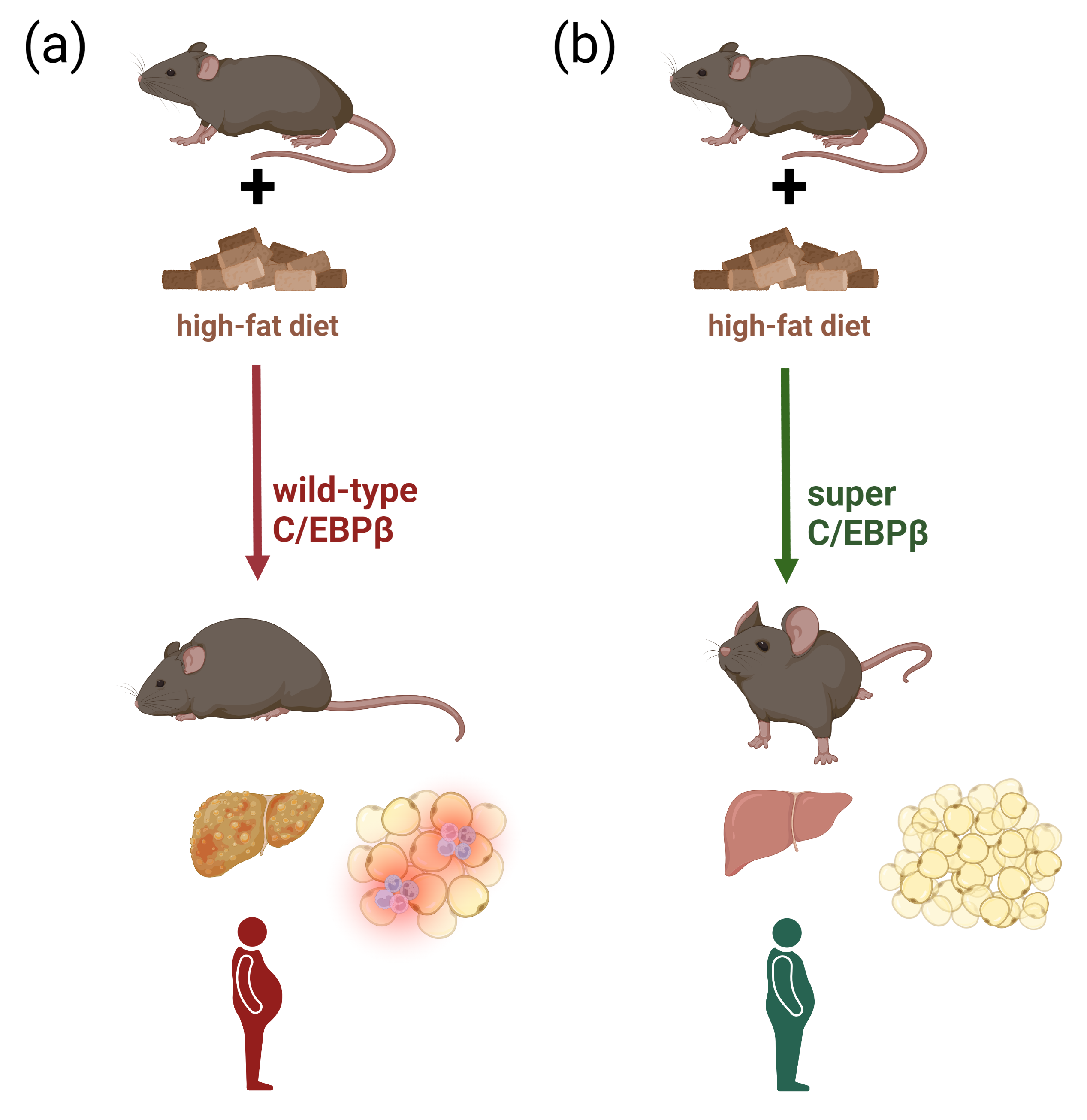 The chronic nutritional and metabolic disease of obesity is characterized by an excessive increase in body fat and its accumulation in tissues. Those who suffer from obesity also have an increased risk of concomitant or secondary diseases such as type 2 diabetes, fatty liver disease, and atherosclerosis. Researchers at the European Research Institute for the Biology of Ageing (ERIBA) in Groningen, the Netherlands, and the Leibniz Institute on Aging - Fritz Lipmann Institute (FLI) in Jena, Germany, have now demonstrated for the first time in a mouse model how the transcription factor C/EBPβ can positively influence fat storage and maintain health even under a particularly high-fat diet.