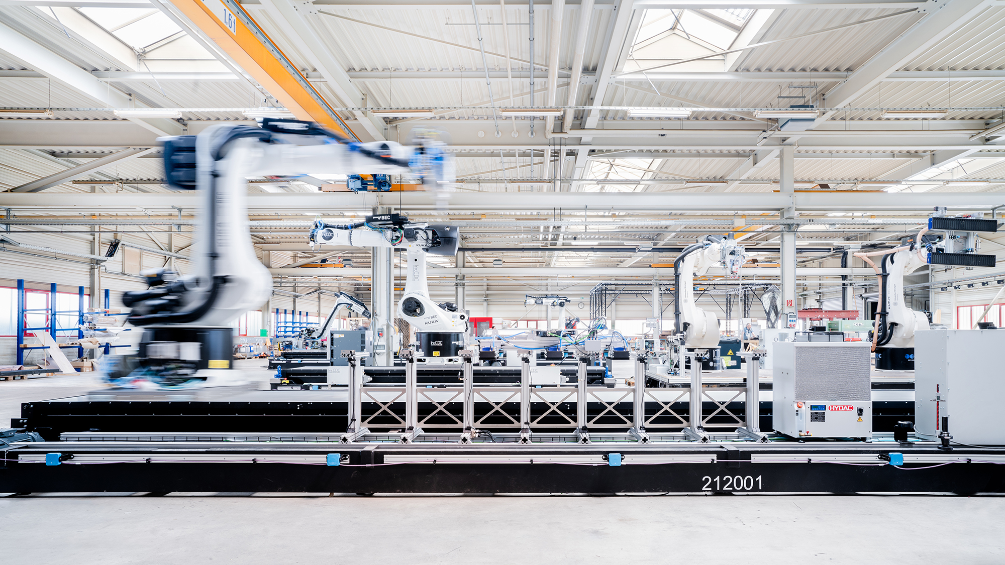 Die Fabrikhalle in Neustadt-Hohenacker, einem Vorort von Waiblingen, wirkt schmucklos, doch sie birgt Superlative: In ihrem Inneren entsteht die weltweit erste Gesamtplattform für cyber-physikalisches Bauen, das Large-Scale Construction Robotics Laboratory (LCRL), ein Großraum-Robotiklabor und Flaggschiff des Exzellenzclusters „Integratives computerbasiertes Planen und Bauen für die Architektur“ (IntCDC) der Universität Stuttgart. Kernstück des Labs für die mobile, flexible Vorfertigungstechnik sind vier containerbasierte Roboter-Plattformen, von denen zunächst zwei für die Fertigung von Holz- und zwei für Faserbauteile ausgelegt sind. Zukünftig sollen sie auch gemeinsam als rekonfigurierbare, digitale Baufertigungseinheit genutzt werden können.