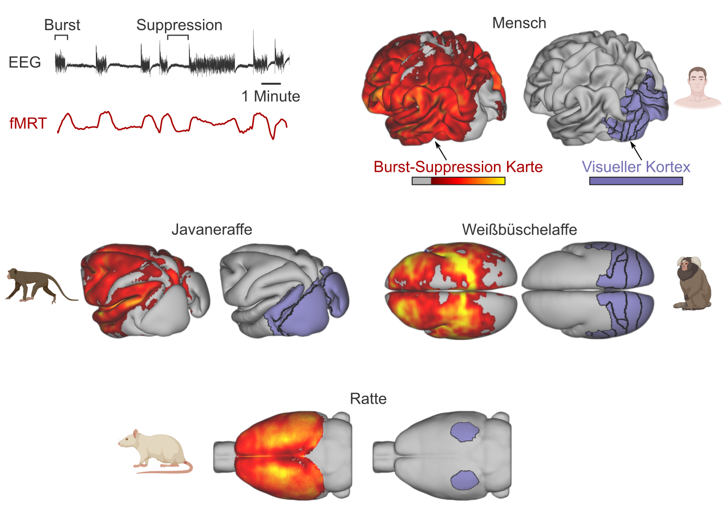 Die Forschenden führten anschließend fMRT-Messungen in narkotisierten Javaner- und Weißbüschelaffen sowie in Ratten durch. In allen Tieren konnten sie die Burst-Suppression in Abhängigkeit von der Konzentration des Narkotikums nachweisen und genau lokalisieren. Die räumliche Verteilung der Burst-Suppression zeigte, dass sowohl im Menschen als auch in den Affenarten bestimmte sensorische Bereiche, wie der visuelle Kortex, davon ausgeschlossen sind. In den Ratten war hingegen die gesamte Großhirnrinde von der Burst-Suppression betroffen.
