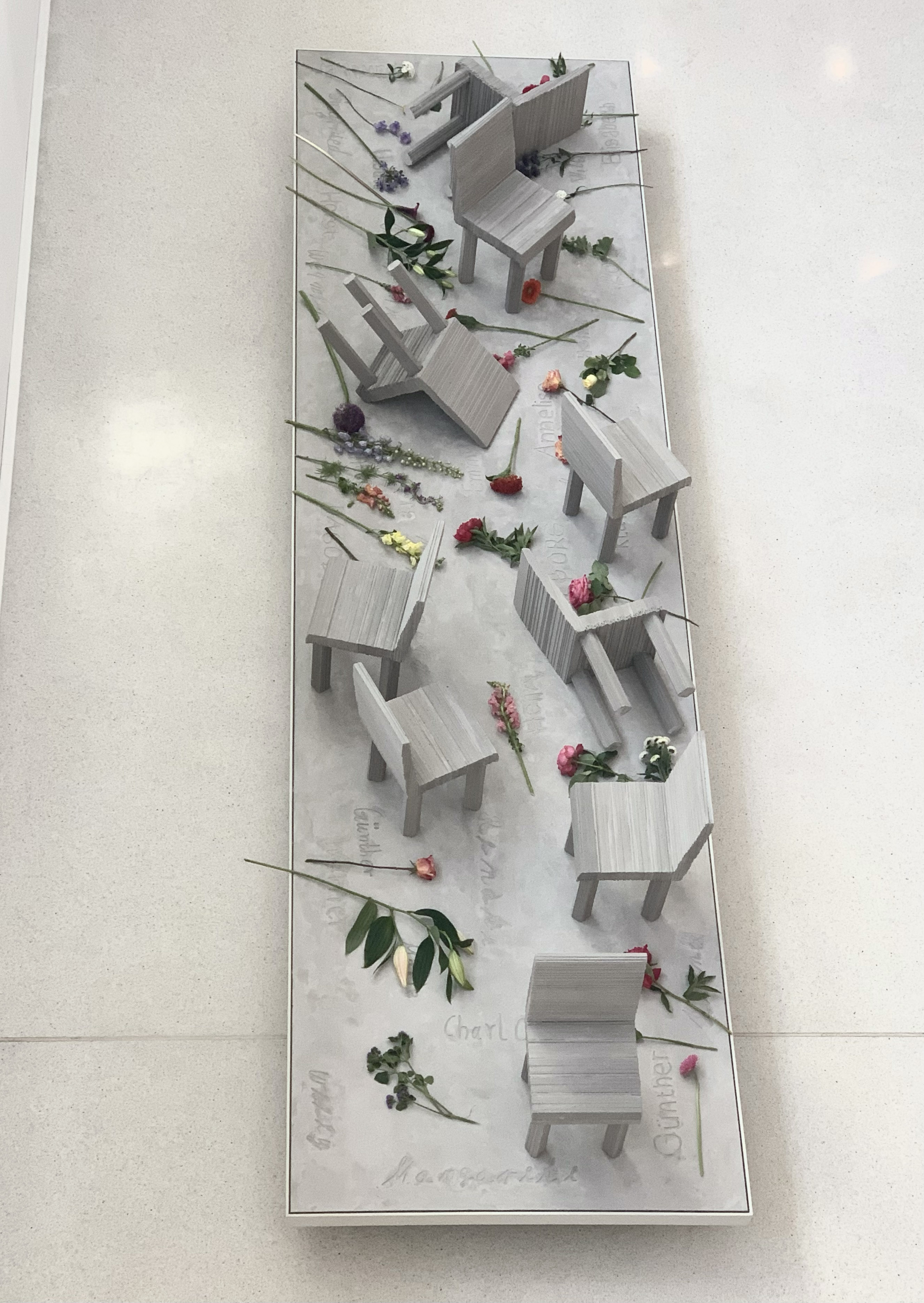 “Never Forget is a picture of emptiness and desolation. It is the collection of nine children's chairs, arranged on a platform, in which the names of 38 of those children killed in Brandenburg-Görden are engraved. They are hard and awkward looking sharp-edged objects, nothing that invites one to sit on them”, shares Cuticchio. “Some are still standing, others are tilted, as if a child had been pulled away from them by force. Nothing to tell of child-like treatment, but to remind us of the daily torment and pain of those who were labeled "unworthy of life" by their tormentors.”