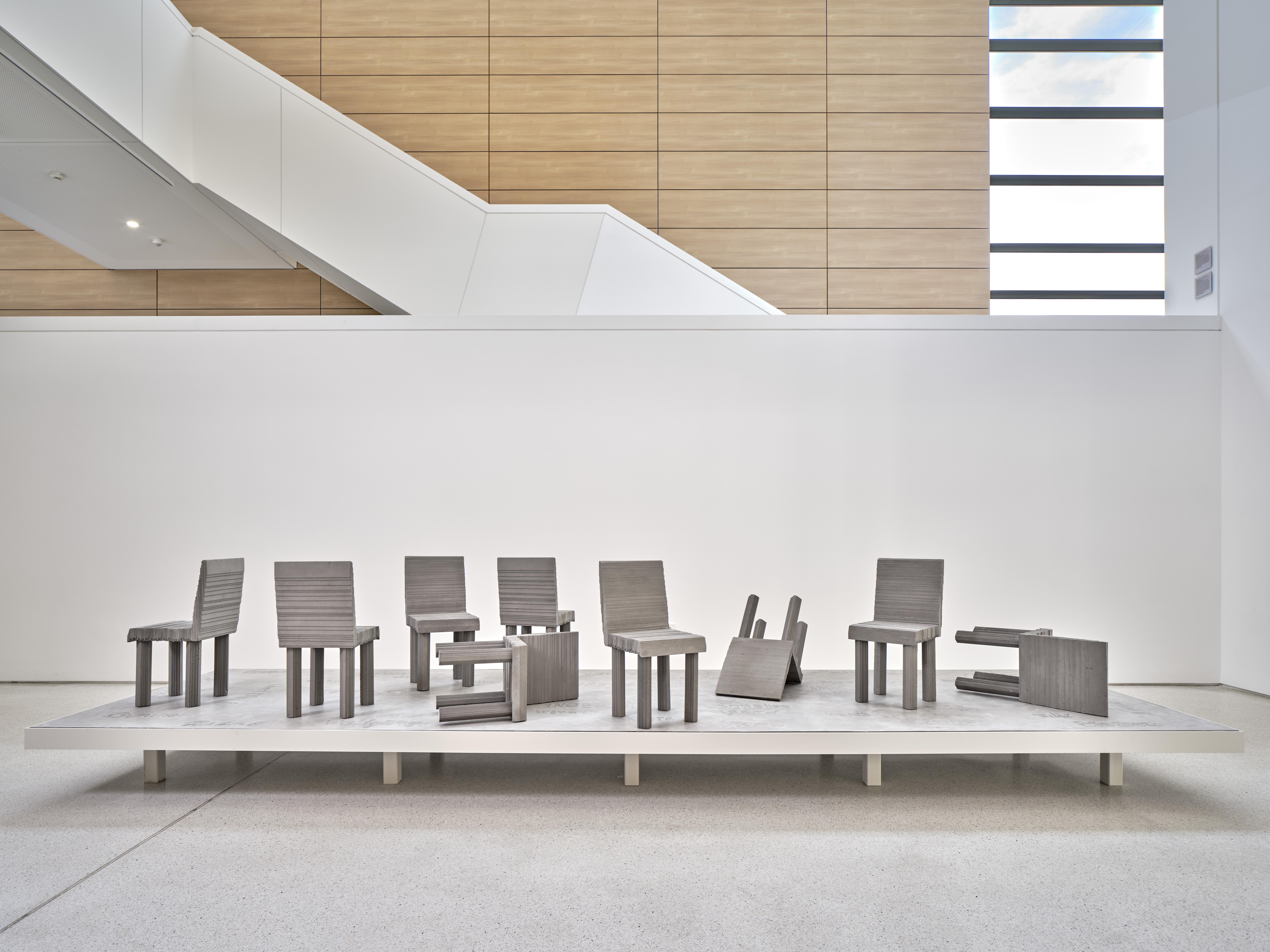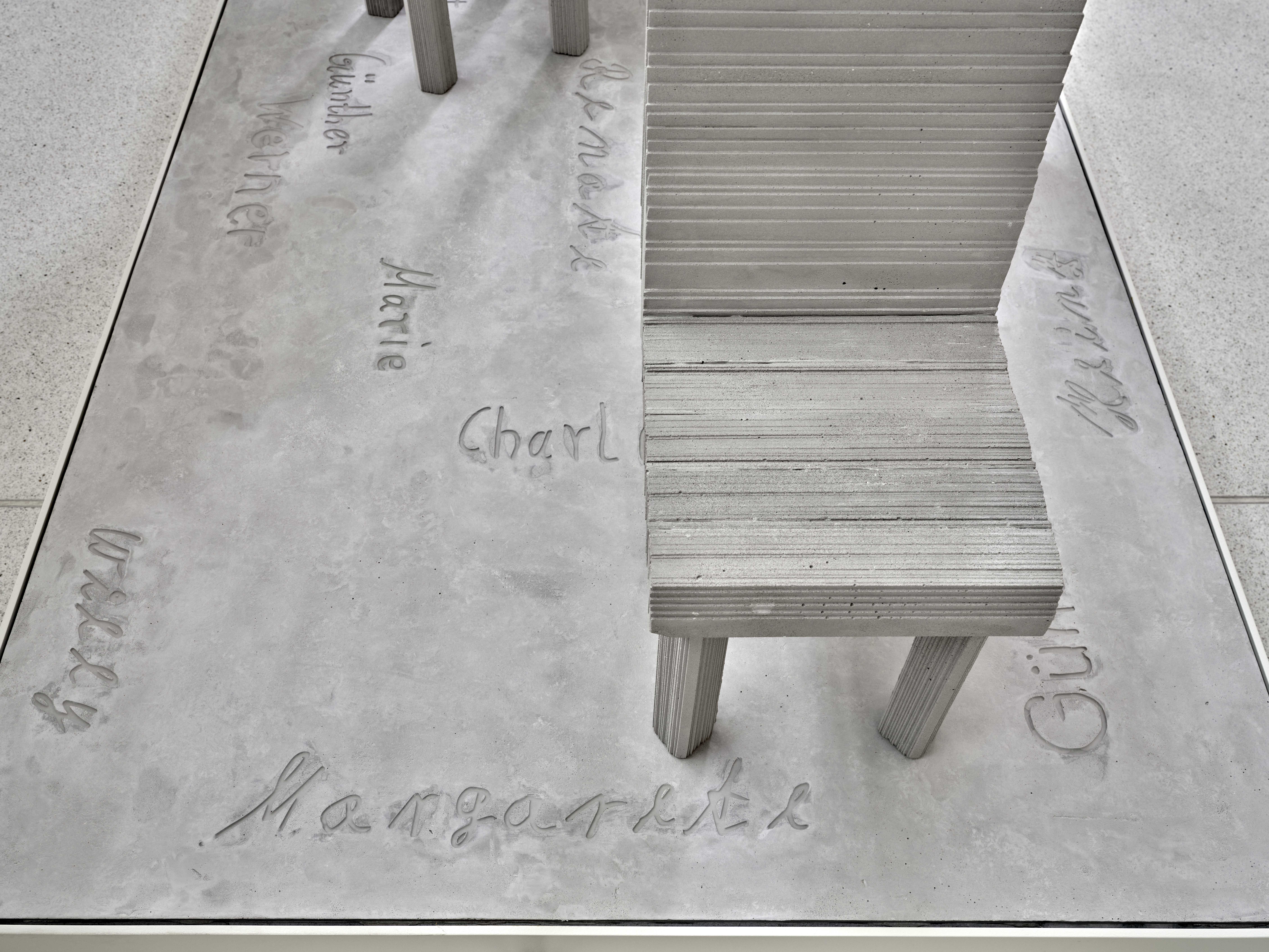The concept and realization of “Never Forget” were the responsibility of Christiane Cuticchio, Sven Fritz and Lutz Pillong. In collaboration with Lothar Zaubitzer and Lutz Pillong, a model of a chair was created from cardboard, which was later cast in concrete in nine copies at Studio Ostpool by Anselm Baumann and placed on the platform, also designed at Atelier Goldstein and realized by Baumann. The 38 names of the children killed were designed by Atelier Goldstein artists Dustin Eckhardt, Tina Herchenröther, Franz von Saalfeld, Markus Schmitz, Selbermann.