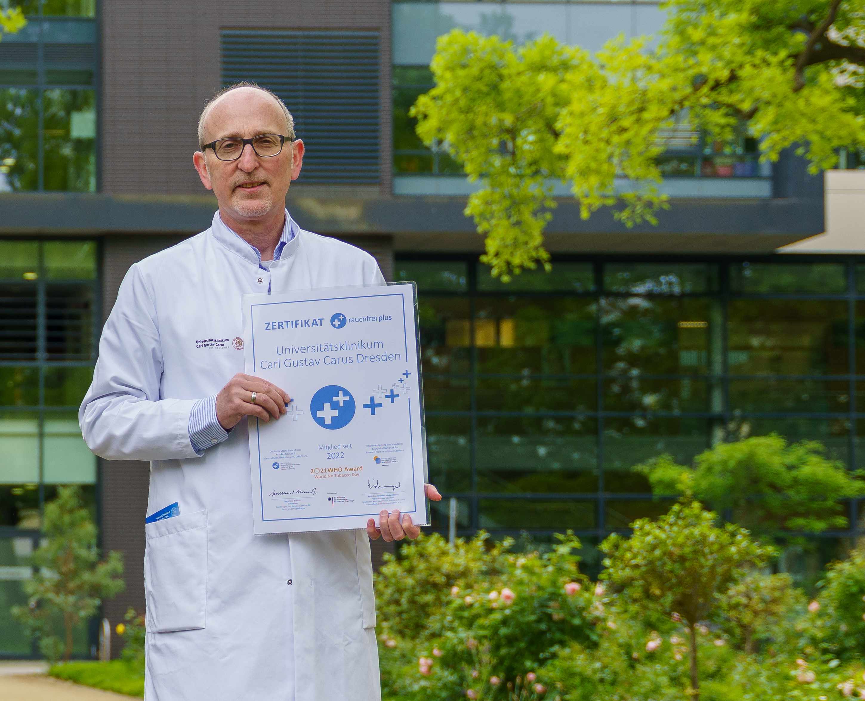 Das Universitätsklinikum Carl Gustav Carus Dresden ist seit dem 30. Mai 2022 Mitglied im „Deutschen Netz Rauchfreier Krankenhäuser & Gesundheitseinrichtungen“. Aus dieser Mitgliedschaft resultiert die Pflicht, schrittweise die Standards des „Global Network for Tobacco Free Health Care Services“ an der eigenen Einrichtung zu etablieren. Nach der Auszeichnung der Medizinischen Klinik I des Uniklinikums mit dem Bronze-Zertifikat des globalen Netzwerks hat der Klinikumsvorstand entschieden, die damit verbundenen Standards nun im kompletten Universitätsklinikum zu etablieren. Ziel ist es, mit niedrigschwelligen, jederzeit verfügbaren Angeboten den Ausstieg aus dem Tabakkonsum zu erleichtern.