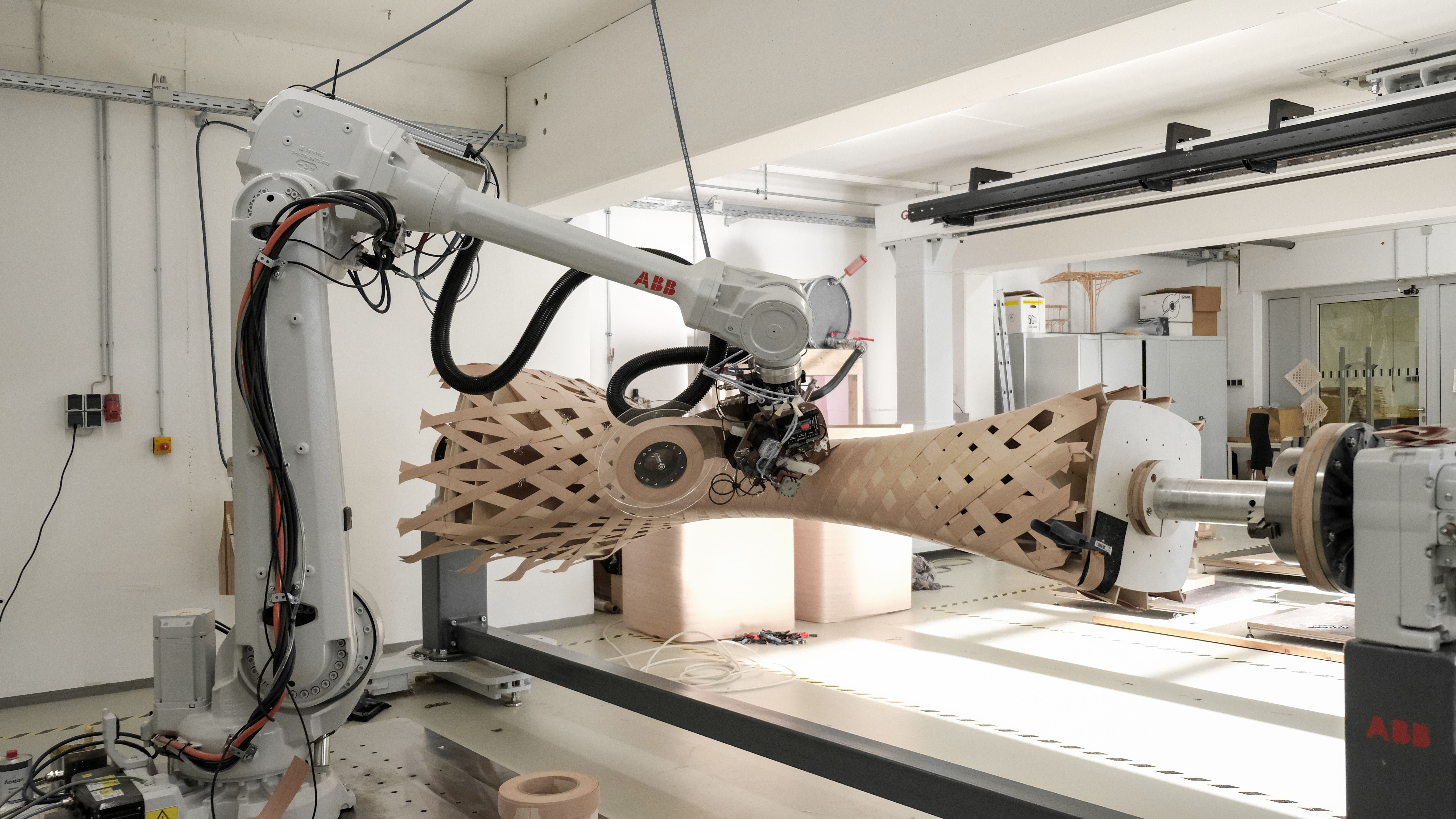 Im Fokus des Messeauftritts steht der „3DWoodWind Research Prototype“ – eine Holzdachstruktur an der Schnittstelle zwischen KI-Algorithmen, digitalen Konstruktionsprinzipien und automatisierter Fertigung. Der per Roboter gefertigte Prototyp zeigt, wie Leichtbauteile aus Holz entstehen, die in Zukunft auch als Ersatz für Beton- oder Stahlsysteme in Gebäuden dienen können. Forschende der Universität Kassel und der Leibniz Universität Hannover haben den Prototypen im Auftrag des BBSR entwickelt.
