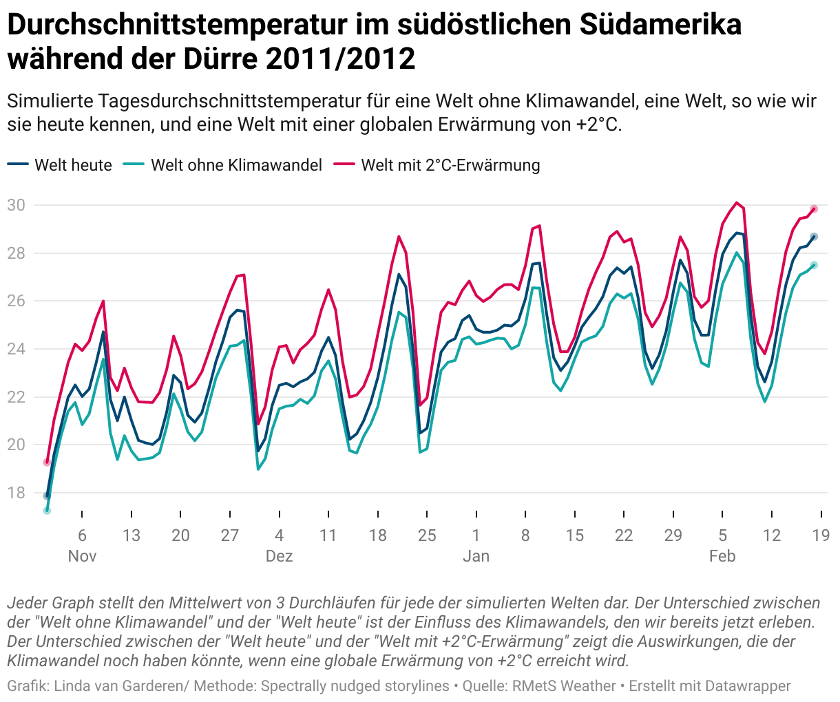 Auf diese Weise war van Garderen in der Lage, die drei Welten über einen Zeitraum von fünf Jahren (2010 - 2014) zu rekonstruieren. Ihr Fokus lag dabei auf schweren Extremereignissen in der Vergangenheit, deren Ergebnisse sie aus der jeweiligen Welt miteinander verglich. Van Garderen konnte so nicht nur nachweisen, dass der Klimawandel bestimmte Wetterextreme in der Vergangenheit verstärkt hat, sondern auch, dass die Folgen in einer 2-Grad-Welt noch drastischer gewesen wären: Bei der Dürre in der SESA-Region wären die lokalen Temperaturen im Vergleich zu heute um bis zu drei Grad wärmer gewesen, was zu einer verstärkten Verdunstung der Feuchtigkeit aus dem Boden und der Vegetation geführt hätte. Dadurch hätte sich die Dürre noch weiter verschärfen können.