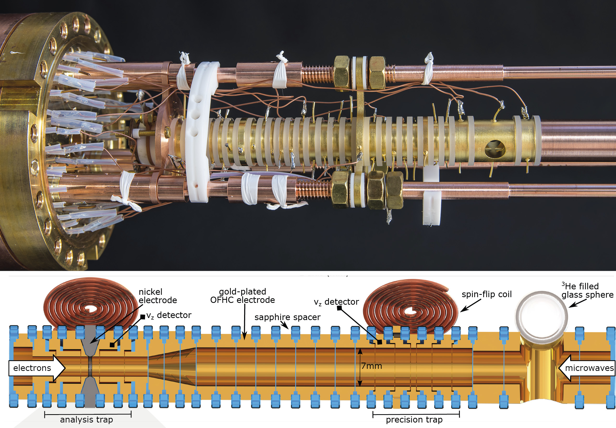 For the experiment, the researchers of the division of Klaus Blaum at MPIK together with collaborators from the University of Mainz and RIKEN (Tokyo, Japan) used a single-ion Penning trap (Fig. 2) to measure the transition frequencies between the hyperfine states and simultaneously the magnetic field, via the accurate determination of the cyclotron frequency of the trapped ion. Antonia Schneider, first author of the article, describes the setup of the trap: “It is placed inside a 5.7 Tesla superconducting magnet and consists of two parts: a precision trap for the measurement of the ion frequencies and the interaction with the microwave radiation and an analysis trap to determine the hyperfine state.” For each transition, the spin-flip rate reaches a maximum at resonance. The g-factors and the zero-field hyperfine splitting are then extracted from the analysis of the resonance curves. The new experimental setup improves the precision for the g-factors by a factor of 10 to the level of 10–10.
