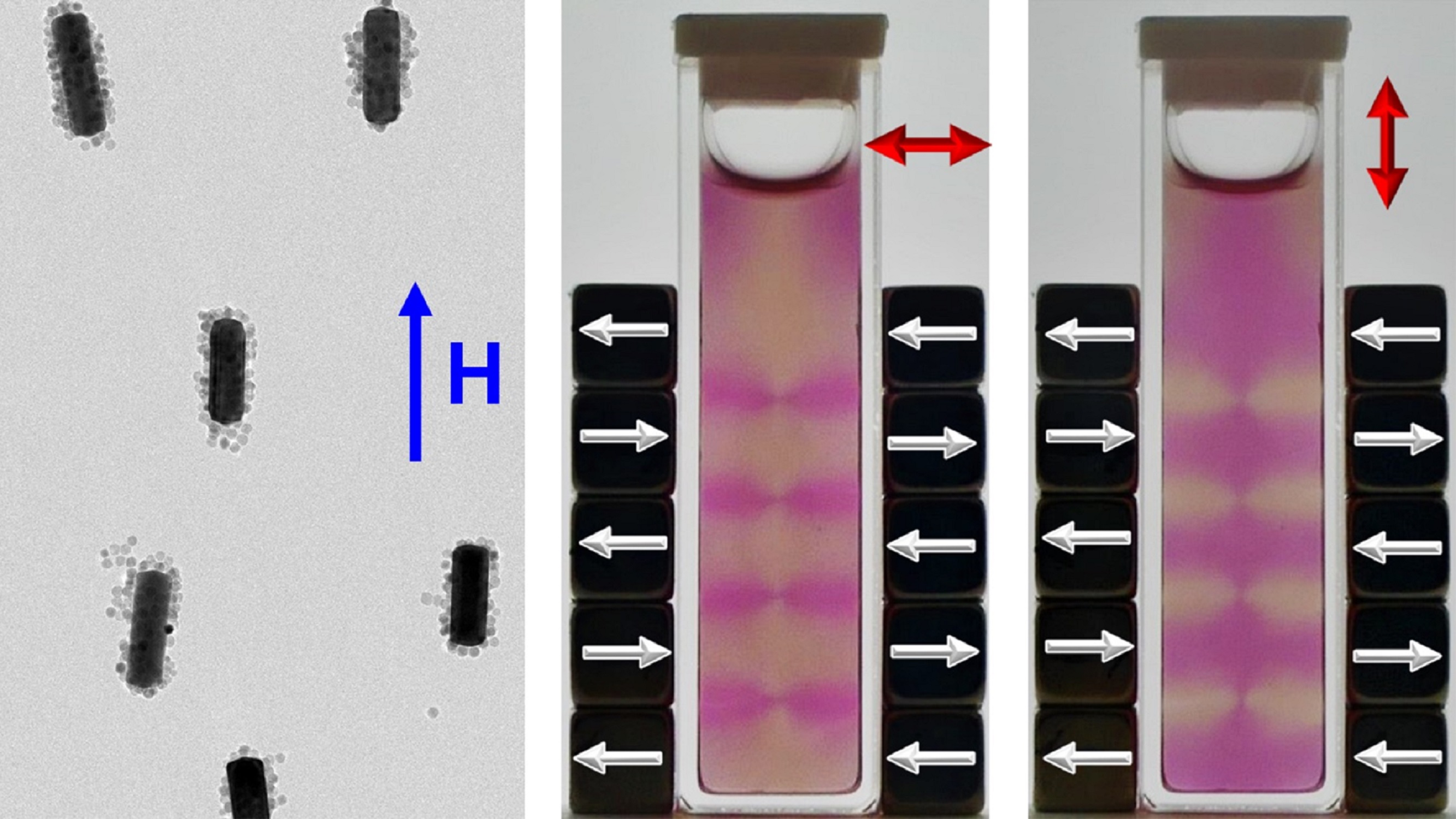 In wässriger Dispersion richten sich mit Eisenoxidnanopartikeln dekorierte Goldnanoteilchen entsprechend der durch spezielle Anordnungen von Permanentmagneten erzeugten Magnetfeldmuster aus. Daraus resultiert polarisationsabhängige Absorption und Streuung von Licht hat. Doppelpfeile zeigen die Polarisationsrichtung eines linearen Polarisators an, durch welchen die Fotoaufnahme gemacht wurde.