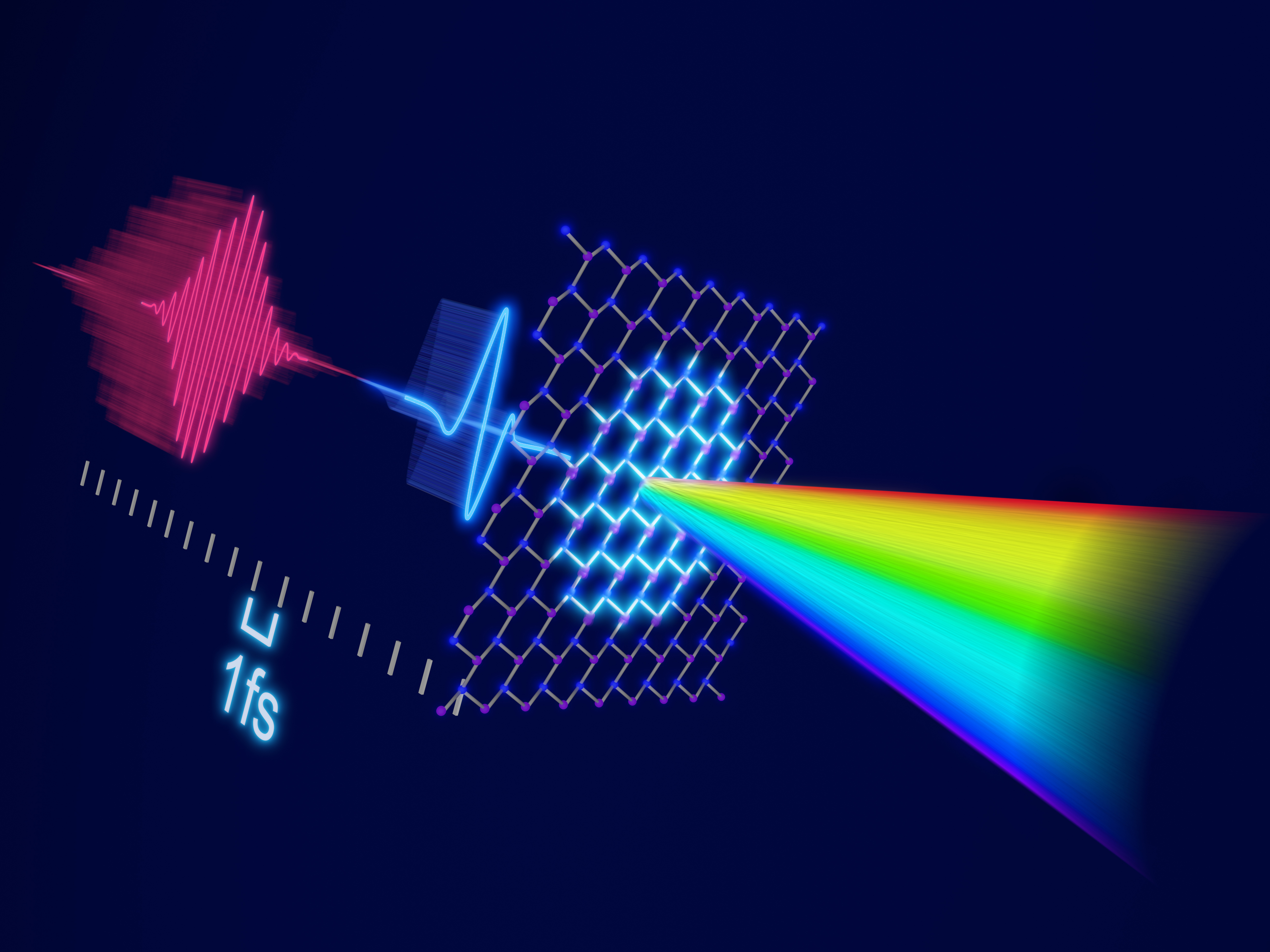 The team studied a monolayer of hexagonal boron nitride (hBN) just one atom thick, whose lattice can be excited to vibrate on timescales of tens of femtoseconds. A first ‘pump’ laser pulse hits the material, making the atoms move in unison. Subsequently, a second infrared laser pulse excites the electrons yet further, so that they cause the emission of light at new frequencies - the high harmonics. These contain the underlying information about the lattice vibrations (also known as phonons). By analysing them, scientists gain detailed new insights into those atomic motions.