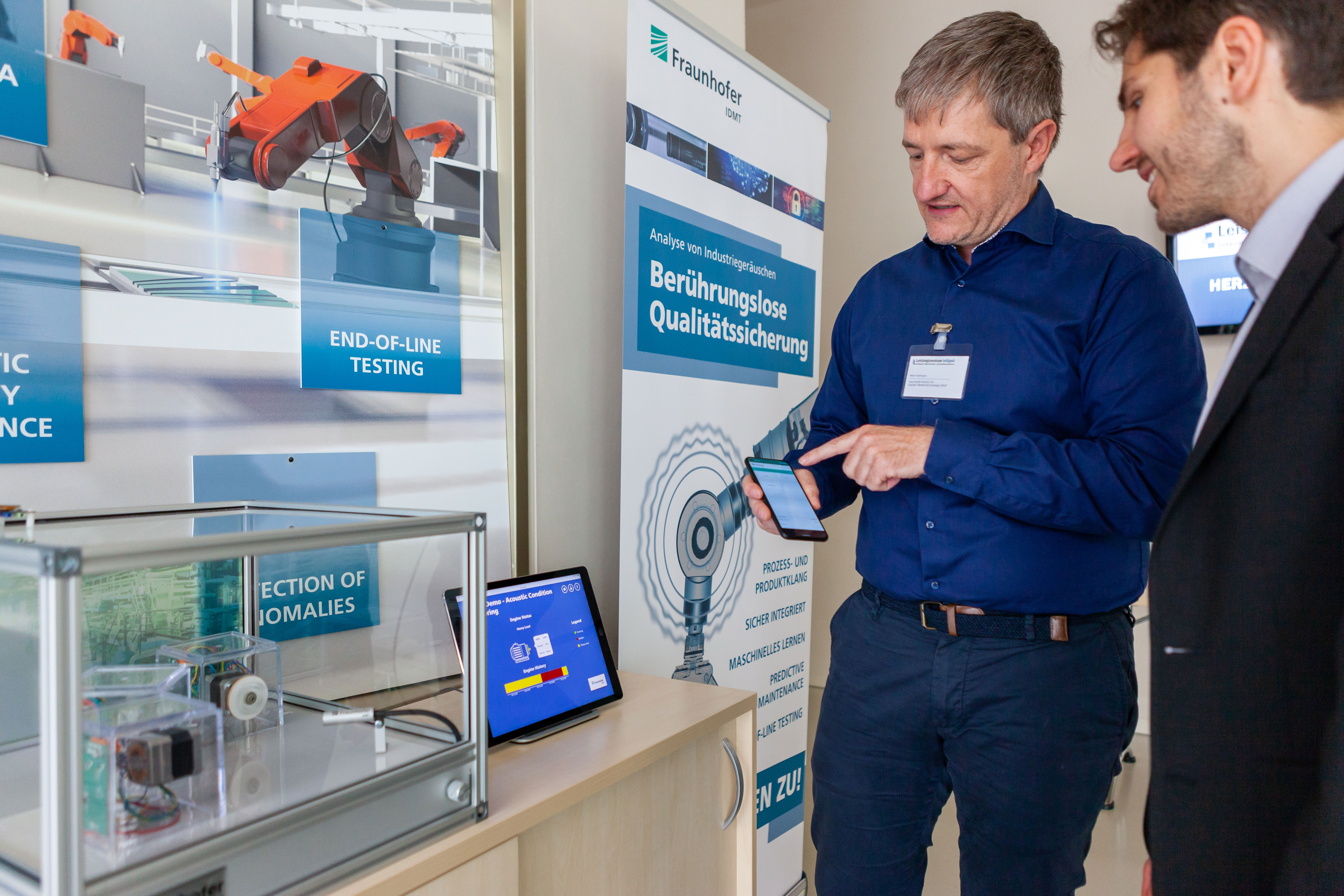 Wie Maschinen, Anlagen und Prozesse zukünftig einfach und schnell hinsichtlich ihres ordnungsgemäßen Zustands sensorisch überwacht werden können, war Thema eines weiteren Demonstrators. Dabei wurden drei unterschiedlich klingende Elektromotoren mit KI-basierter Audiosignalanalyse unter Einsatz eines Smartphones erkannt und klassifiziert. Zukünftig kann also jeder Instandhaltungsingenieur zum Beispiel mit seinem Diensthandy überprüfen, ob es Unregelmäßigkeiten beim Klang der Fertigungsprozesse oder an der Maschine gibt. Dank der Analyse können die Qualität und die Zuverlässigkeit von Produkten gesteigert und der Ausschuss reduziert werden. Ein wichtiger und auch kontrovers diskutierter Punkt bei der sensorischen Erfassung und Auswertung der Daten ist der Datenschutz. Oftmals müssen Bedenken ausgeräumt werden, dass Industriedaten zur Konkurrenz abwandern oder missbraucht werden. Dafür bietet das Leistungszentrum InSignA technische Lösungen für Datenschutz und Datensicherheit. Das schafft völlig neue Möglichkeiten des effizienten Zusammenwirkens mehrerer Unternehmen.