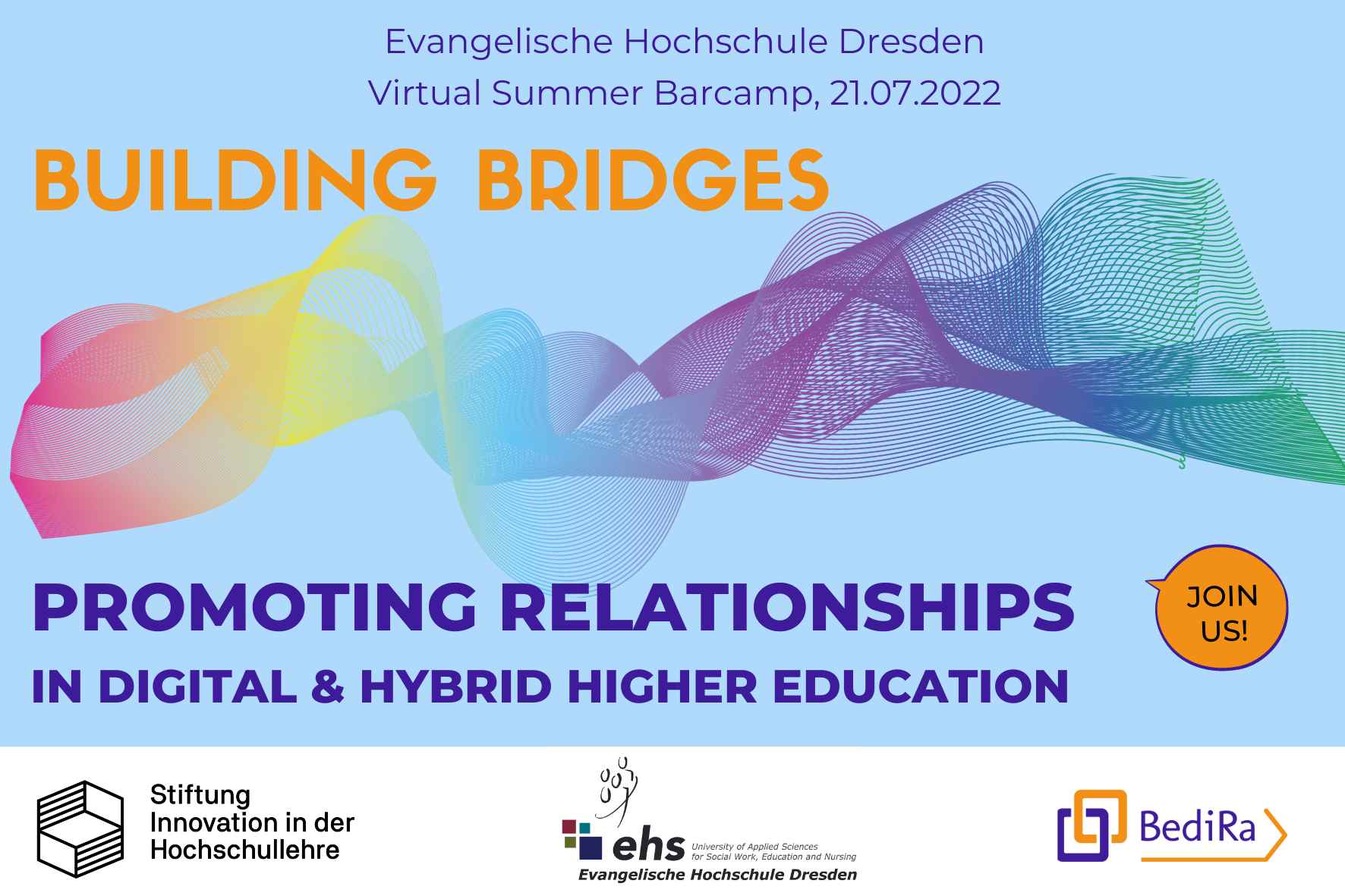 Die Evangelische Hochschule Dresden (ehs) lädt zum Virtual Summer Barcamp “Building Bridges – Promoting relationships in digital & hybrid higher education“ am 21. Juli 2022 ein. Das Barcamp findet von 9:00 bis 15:00 Uhr statt und geht der Frage nach, wie digitale und hybride Lehre weiterentwickelt werden muss.
