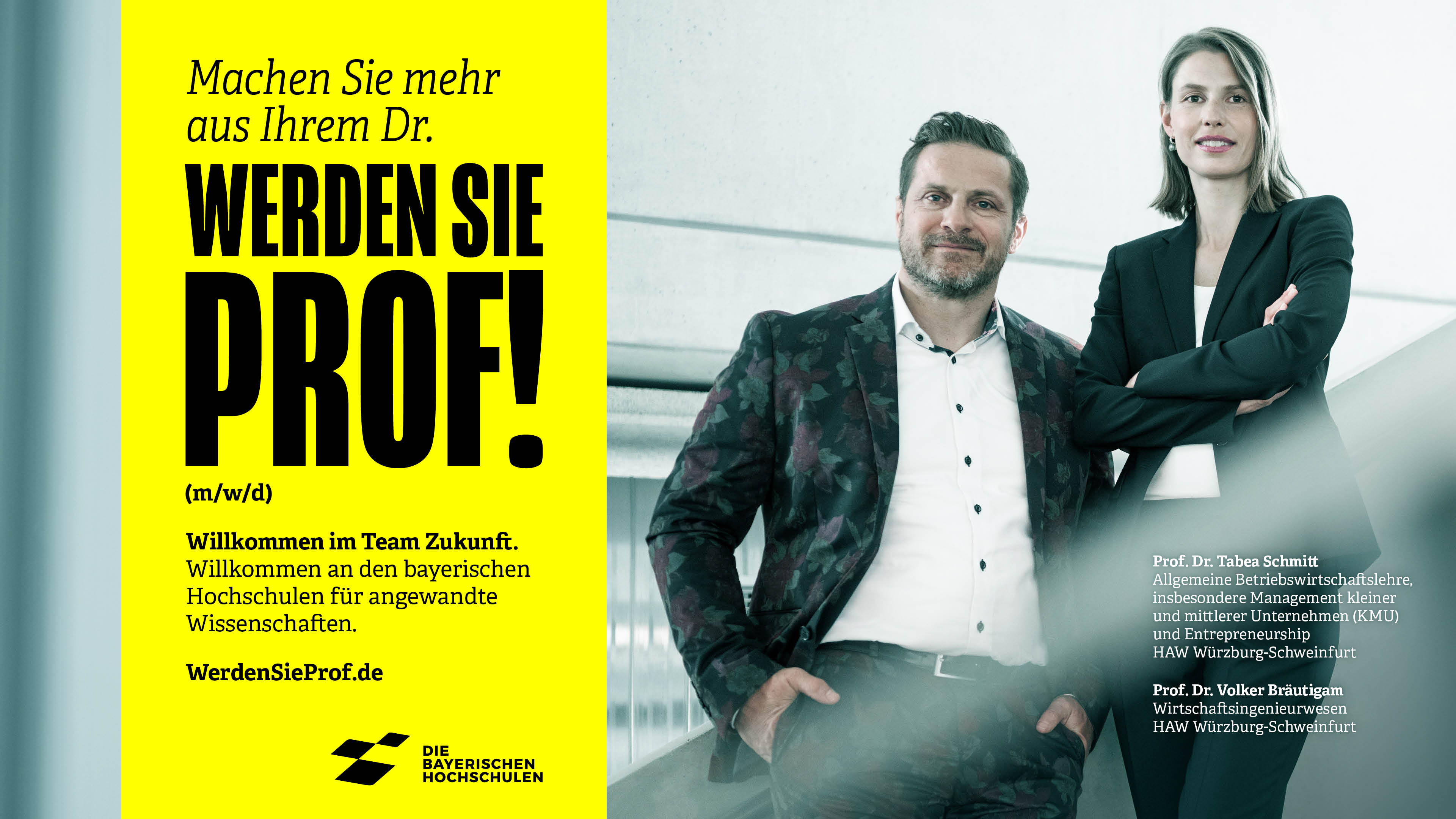 Die Bayerischen Hochschulen für angewandte Wissenschaften (HAW) erfahren derzeit einen nie dagewesenen Entwicklungsschub. Im Rahmen der Hightech Agenda werden an den HAWs aktuell 1200 Stellen geschaffen, darunter rund 550 neue Professuren in spannenden und innovativen Studienfeldern von Pflege bis KI. Mit der Kampagne „Machen Sie mehr aus Ihrem Dr. – Werden Sie Prof!“ bewerben die Bayerischen Hochschulen die Attraktivität des Berufes der Professorin und des Professors an einer HAW mit dem Ziel, die besten Köpfe für eine Karriere an den Bayerischen Hochschulen zu gewinnen.