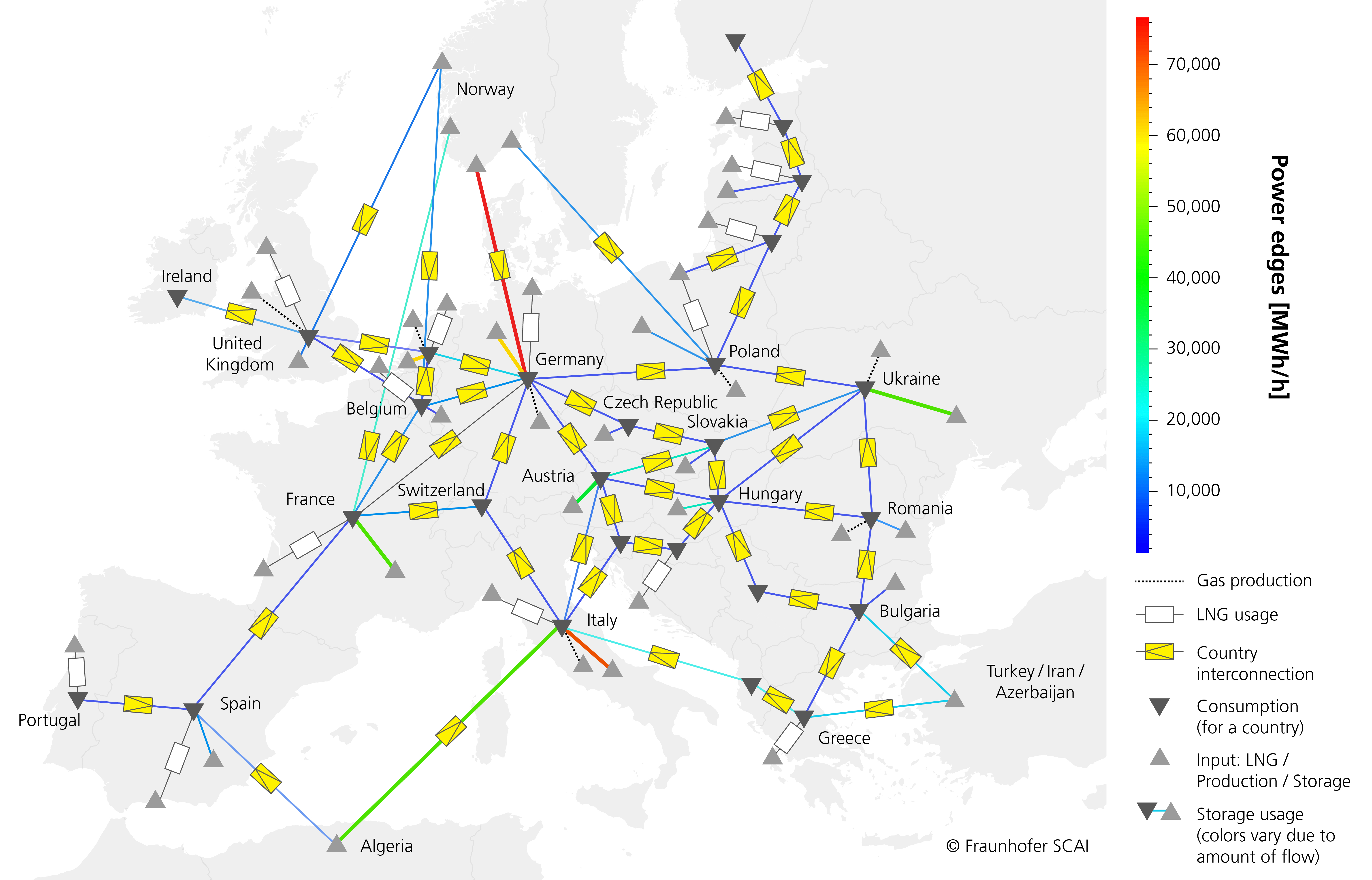 To simulate the European gas network, the researchers used the MYNTS (Multiphysical Network Simulator) simulation software developed by Fraunhofer SCAI. The software, which is in use by numerous network providers, is designed to analyze and optimize the operation and planning of complex networks for gas, electricity, and water. MYNTS models and simulates the networks as a system of differential-algebraic equations. The simulation results immediately indicate the effects of changes in various factors, such as limited flow rates.