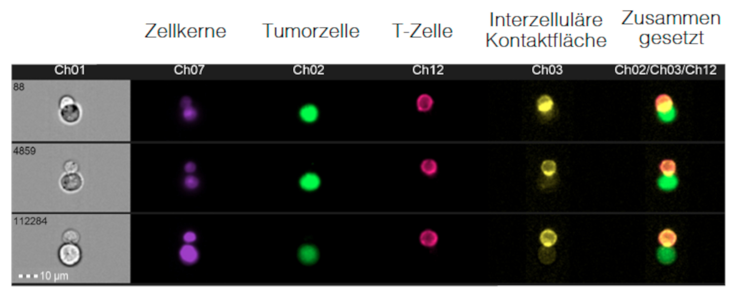In einer detaillierteren Betrachtung wurde beobachtet, dass kostimulatorische Moleküle auf Tumorzellen die nachgeschalteten Signalwege in T-Zellen beeinflussen. Für die Wirkung von biAb-Therapien ist zudem die Konjugatbildung (direkter Zell-Zell Kontakt) zwischen Target- und Effektorzelle wichtig: Mithilfe von Imaging Flow Cytometry zeigte sich, dass die Konjugatbildung durch kostimulatorische Antigene beeinflusst wird (siehe Abbildung 2). Die Expression von kostimulatorischen Molekülen erhöhte dabei signifikant die Konjugatbildung, verglichen mit Zellen ohne kostimulatorische Moleküle oder Zellen mit koinhibitorischen Molekülen. Zusammenfassend stützen diese Daten die Hypothese, dass die Wirksamkeit von biAb-Therapien, durch kostimulatorische und koinhibitorische Moleküle beeinflusst wird. Für die klinische Anwendung könnte das bedeuten, dass der Antikörper je nach Vorhandensein von kostimulatorischen und -inhibitorischen Molekülen auf den Tumorzellen als Monotherapie oder in Kombination mit weiteren immunmodulatorischen Substanzen gegeben wird, um koinhibitorische Signale zu überwinden und positive kostimulatorische Moleküle zu ergänzen, z.B. durch die Gabe eines kostimulatorischen Antikörpers, oder eines kostimulatorischen Moleküls wie Lenalidomid. Letztes konnte in der Kulturschule die T-Zellantwort signifikant steigern. (Referenz: Marcinek et al, ASH 2021, Hänel et al, ASH 2021).