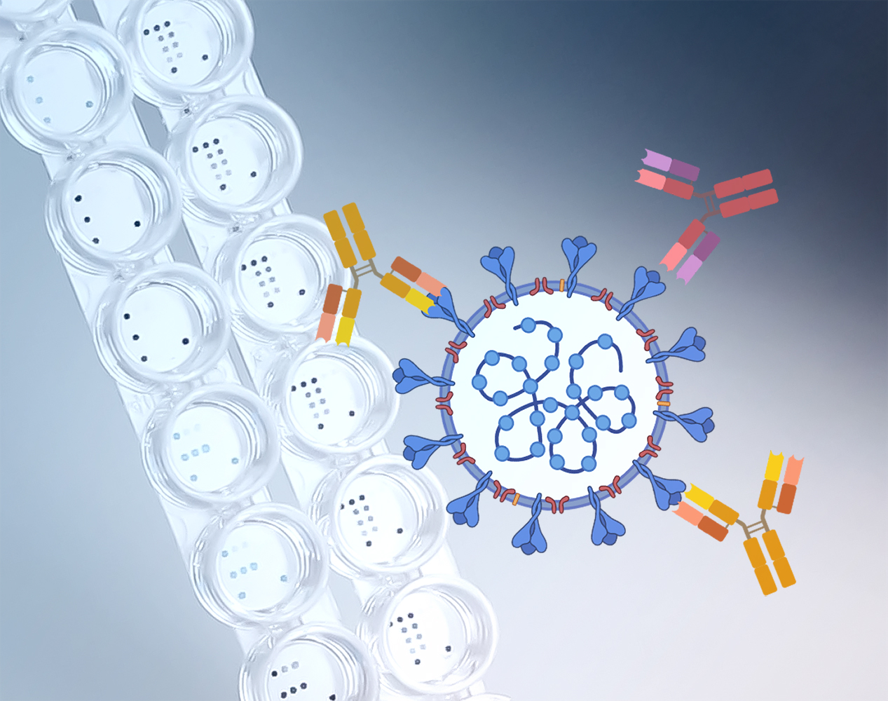 Zentraler Fokus war bei der Entwicklung zunächst ein genaueres Screening der Immunreaktion auf das Coronavirus. Zum Einsatz kam dabei ein sogenannter Protein-Microarray: Das ist ein weniger Millimeter kleiner Chip, auf dem verschiedene Antigene als Fängermoleküle aufgetragen und gebunden sind. Bringt man Antikörper aus dem Patientenblut mit den passenden Antigenen auf dem Chip zusammen, verfärben sich durch eine speziell entwickelte Methode entsprechende Testfelder auf dem Mikroarray – ein gesuchter Antikörper muss also im Blut vorhanden gewesen sein.