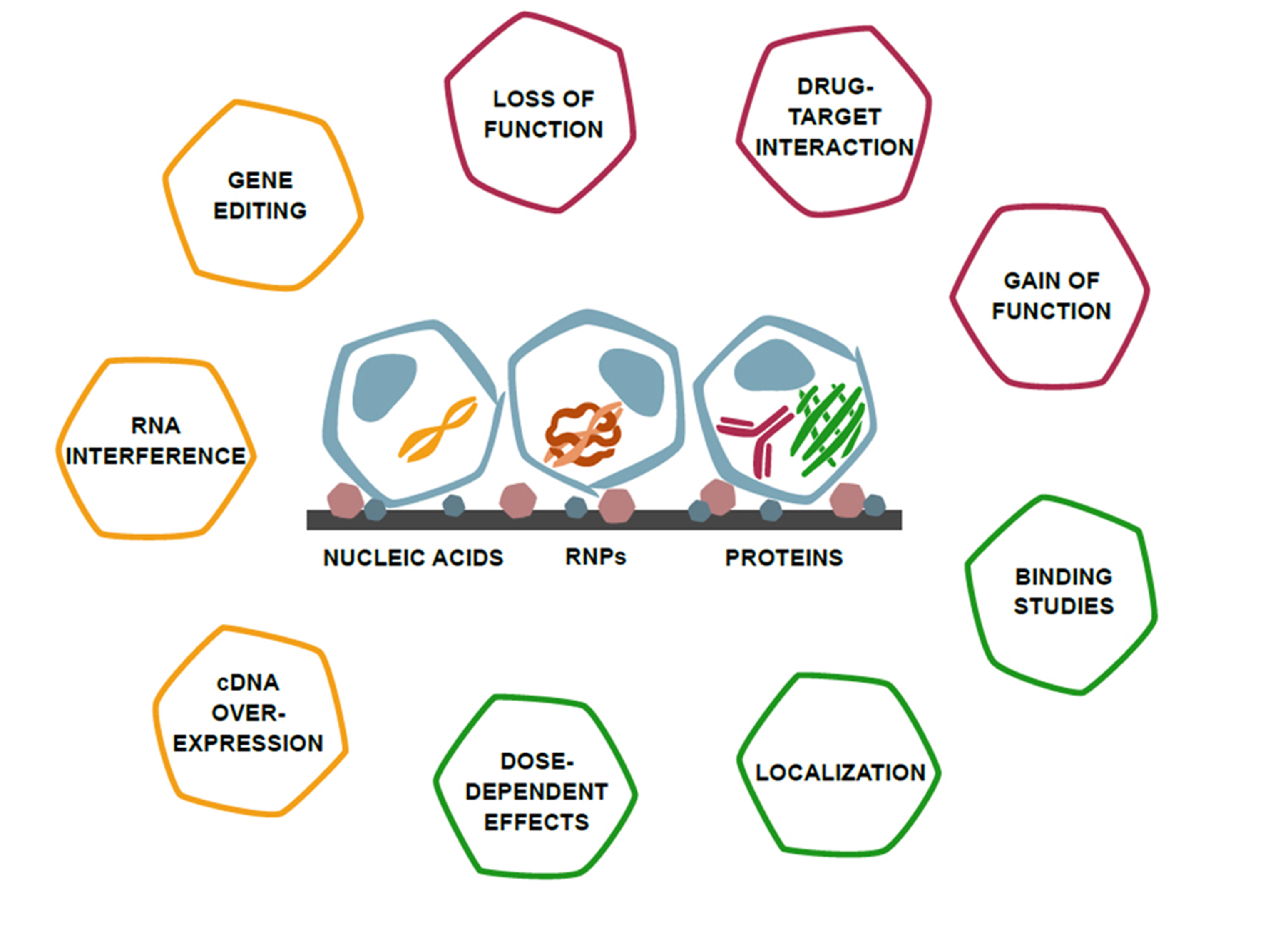 TOP-fase has a very wide range of applications. From "target identification" to "lead optimisation" in target-based drug discovery, from the first screen to target deconvolution in phenotypic drug discovery - the variety of possible applications at all stages of the drug discovery process is enormous. Possible areas of application are, for example, point-of-care diagnostics, protein knock-downs or knock-ins as well as the determination of the localisation of intracellular proteins.