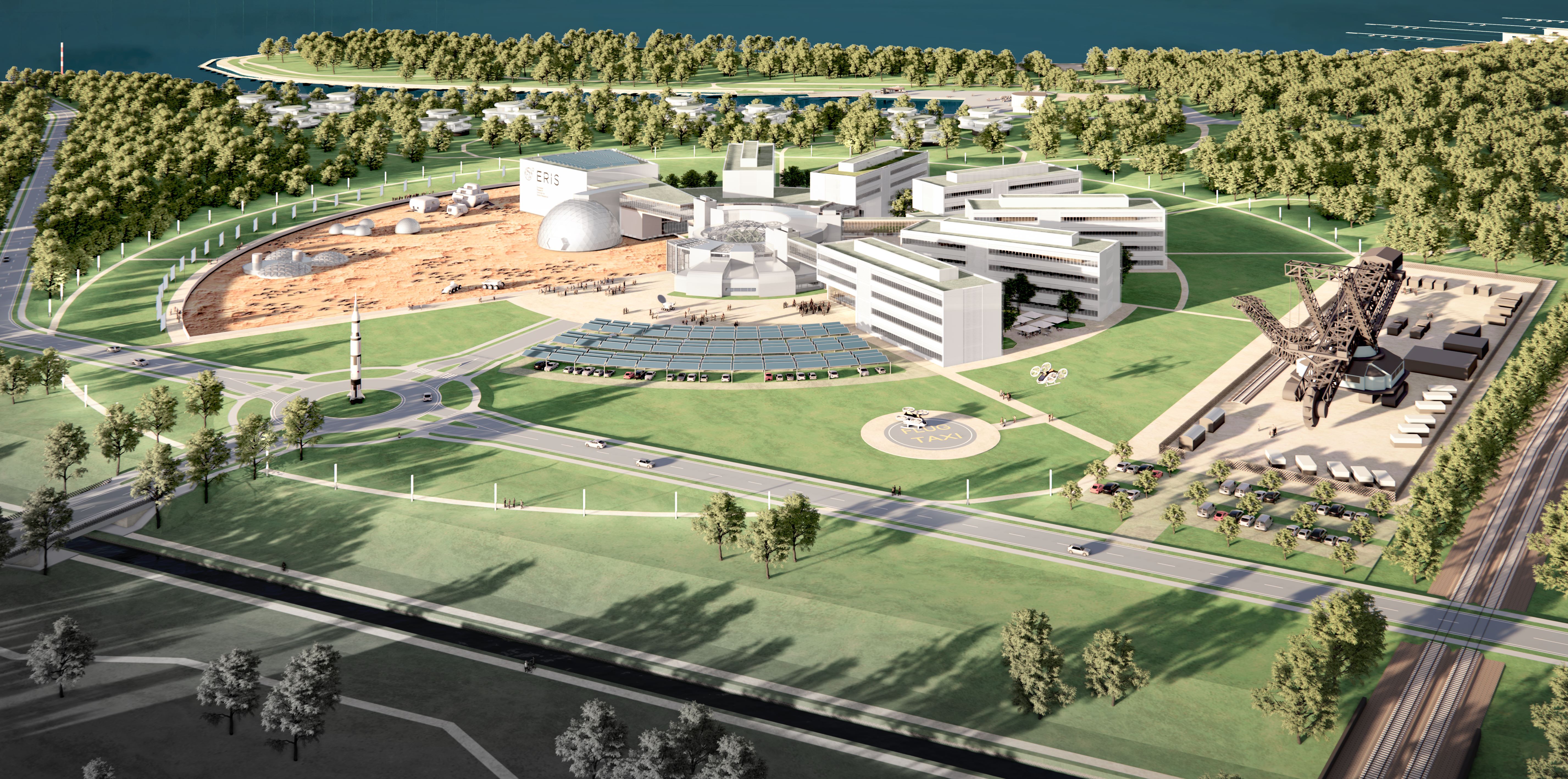 Die Lausitz mit ihrem industriellen Profil einer Kohleregion bringt als Standort bereits hervorragende Voraussetzungen für eine Weltraumforschungseinrichtung mit. Die geforderten Kompetenzen in Rohstoffgewinnung und Verarbeitung, Energieerzeugung und -wandlung sowie -verteilung erfüllt sie als Kohleregion in hohem Maße. Insbesondere die Gewinnung und Aufbereitung von Rohstoffen aus dem Boden erfordern auch auf anderen Planeten zunächst Tagebaukompetenzen. Andererseits kann die Lausitz als Region im wirtschaftlichen Strukturwandel profitieren. ERIS soll Innovationsmotor für ressourceneffiziente, klima- und umweltgerechte sowie digitale, künstlich-intelligente und automatisierte Technologien werden und der Region helfen, neue Geschäftsfelder zu erschließen und mit neuartigen Technologien und Produkten eine Zukunft ermöglichen, die an die stolze Vergangenheit dieser Region anknüpft. Produktion ist ein Schlüssel zu regionaler Wertschöpfung, zur Integration bestehender Ökosysteme sowie Motor industrieller Transformation – und für das Fraunhofer IWU einer der wesentlichen Grün-de, sich für das Projekt in der Lausitz zu engagieren. Das architektonische Konzept zeichnet einen nach innen und außen offenen ERIS-Campus, der auf seinem Gelände viele wissenschaftliche Disziplinen beherbergt - und sich als integraler Bestandteil der Region versteht. Der Anspruch ist, Hand in Hand mit allen politischen Ebenen, Forschungseinrichtungen und örtlichen Firmen an der Transformation der Lausitz zu arbeiten. Bereits in der Hochlaufphase von ERIS werden viele größere und kleinere Player der Region ihre Expertise aus Energiesystemen, Stoffwandlung oder Maschinenbau einbringen können - und haben bereits entsprechendes Interesse bekundet. Beispielsweise ist der Lausitzer Energiekonzern LEAG als Weltmarktführer der Material- und Transportlogistik als einer der ersten Partner an Bord.