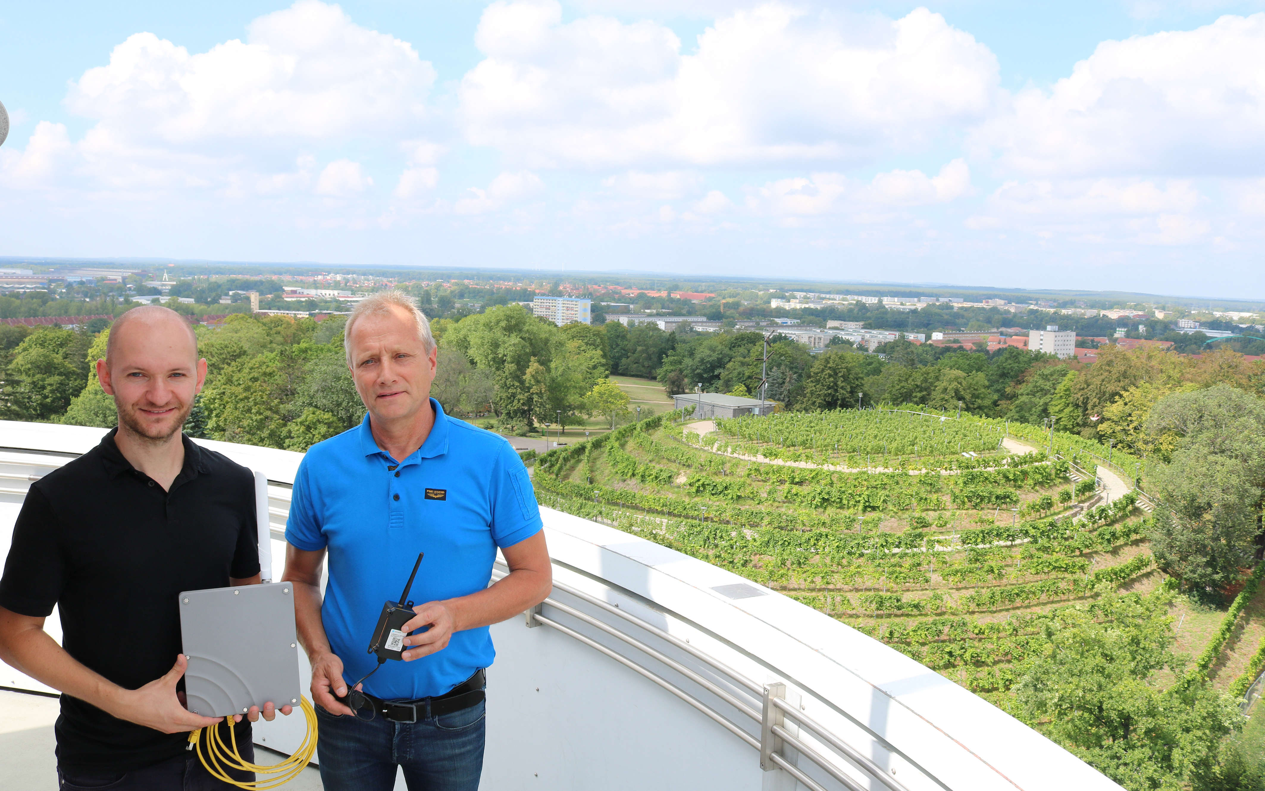 Die Friedenswarte auf dem Marienberg in Brandenburg an der Havel wird fortan zum virtuellen Portal: Prof. Dr.-Ing. André Nitze von der Technischen Hochschule Brandenburg hat dort eine Schnittstelle zur Datenübertragung installiert, mit deren Hilfe unter anderem die Feuchtigkeit im Boden gemessen werden kann. Die notwendige Technologie nahm er nun gemeinsam mit Bernd Prieß aus der Stadtverwaltung von Brandenburg an der Havel in Betrieb.