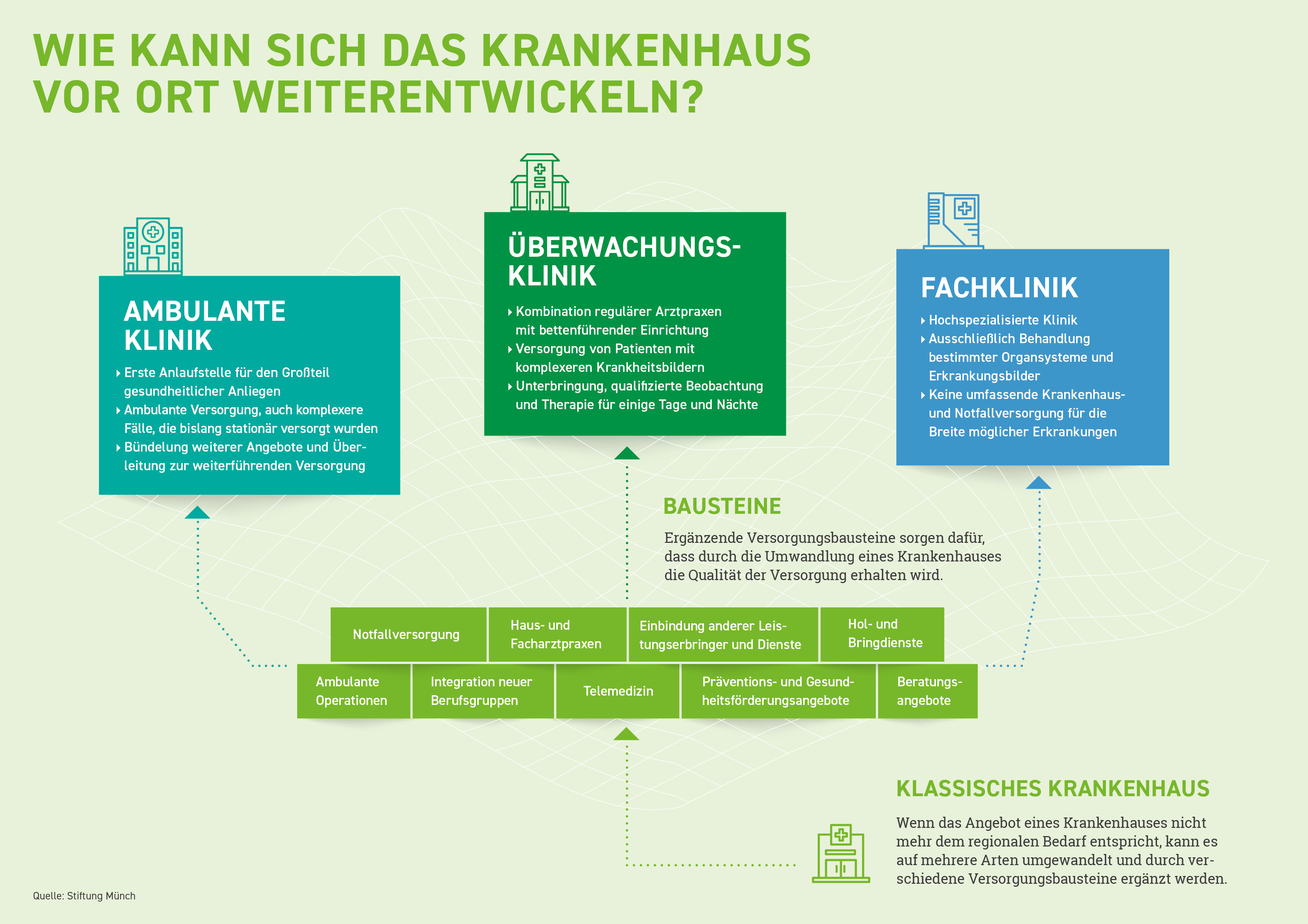 Die Stiftung Münch hat in einer Studie erarbeitet, wie in diesen Fällen das Krankenhaus vor Ort so umgewandelt werden kann, dass eine gute Versorgung erhalten bleibt. Drei verschiedene Typen von Einrichtungen bieten sich an, in die das klassisches Krankenhaus transformiert werden kann: eine ambulante Klinik, eine Überwachungsklinik oder eine Fachklinik.