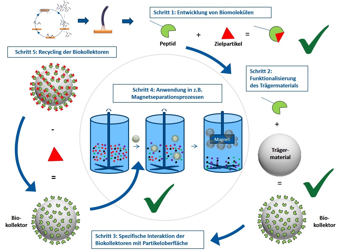 Im Mittelpunkt der PSD-Methode stehen Bakteriophagen. Das sind Viren, die darauf spezialisiert sind, Bakterien zu infizieren. Mit Hilfe der PSD-Technologie wird aus Bakteriophagen mit einer Milliarde verschiedener Biomoleküle das geeignete, also elementspezifische Biomolekül ausgewählt. Im Anschluss wird dieses Biomolekül biotechnologisch hergestellt und auf einem kugelförmigen, magnetischen Trägermaterial verankert. Dadurch entstehen Biokollektoren, die in der Lage sind, ihr Zielelement spezifisch zu erkennen und zu binden.