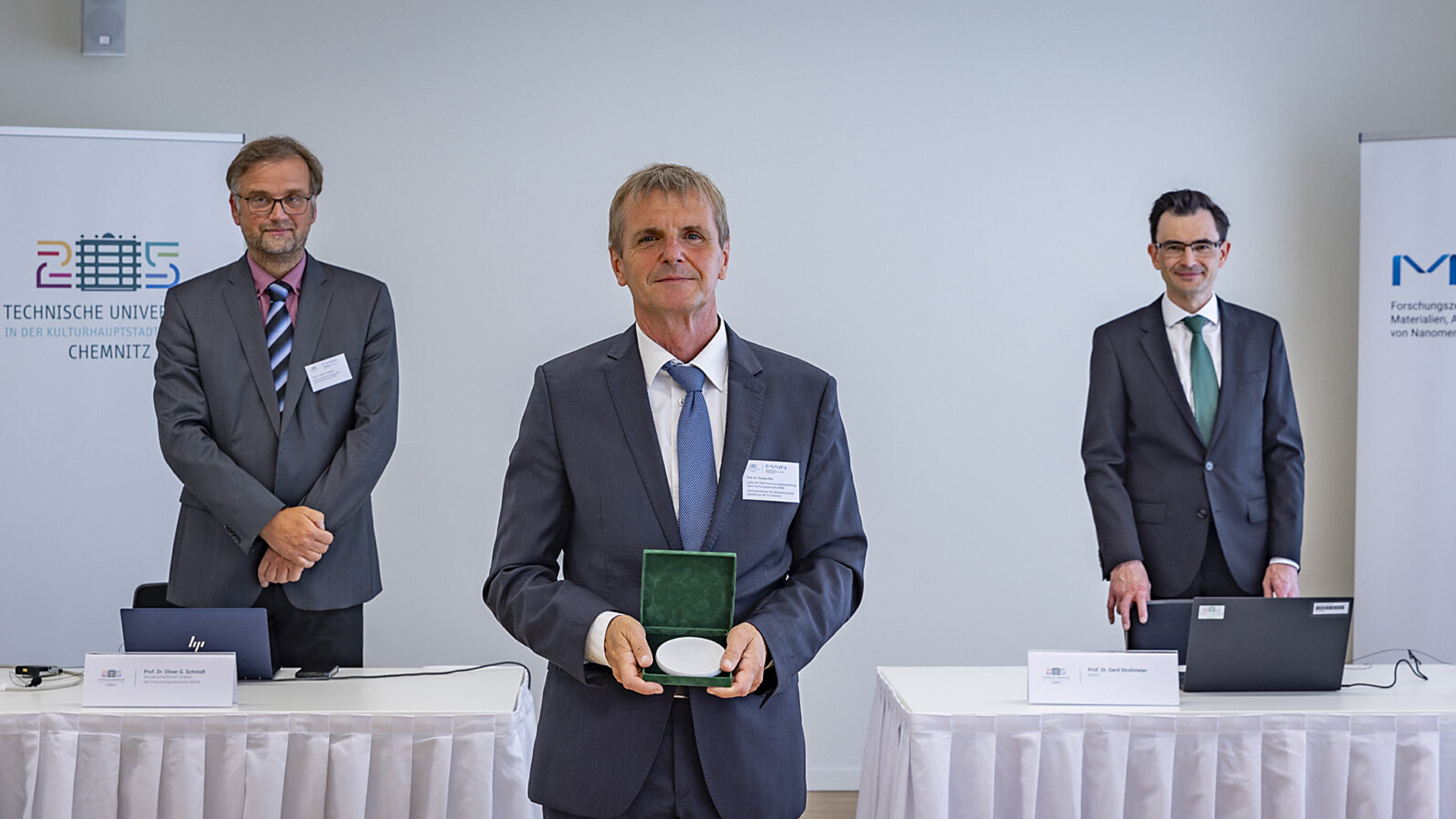For his services to MAIN and beyond, Prof. Otto received the Medal of Honor of Chemnitz University of Technology during the event. "Mr. Otto has dedicated himself in a very special way to the benefit of Chemnitz University of Technology. After the tragic death of Thomas Geßner, he took over the provisional management of the Professorship of Microtechnology as well as the Center for Microtechnologies, led the task force set up for the research center MAIN during the establishment and development phase, and contributed in various areas as a bridge builder in and outside the university," said Strohmeier during the presentation of the Medal of Honor.