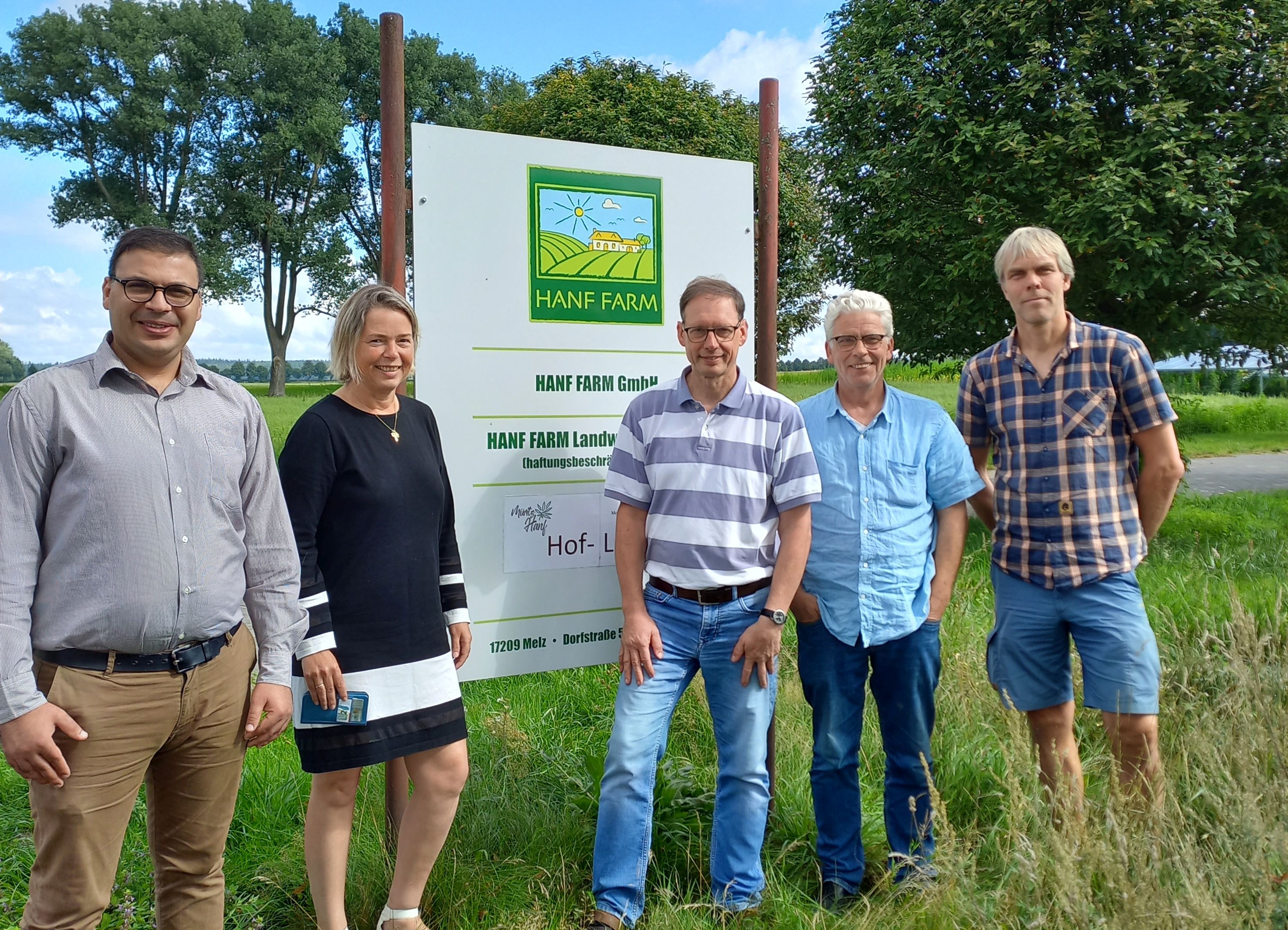 Das ZwiHanf-Team sucht nach Lösungen, um Nitrat- und Treibhausgasemissionen aus der Landwirtschaft zu reduzieren - Dr. Mohamed Amine Daly (FPS/v.li.), Prof. Beatrice Großjohann (FPS), Dr. Björn Kuhla (FBN), Rafael Dulon (Hanffarm) und Prof. Eike Stefan Dobers (HS-NB). Hanf ist von der Anbauzeit eine Zwischenfrucht.