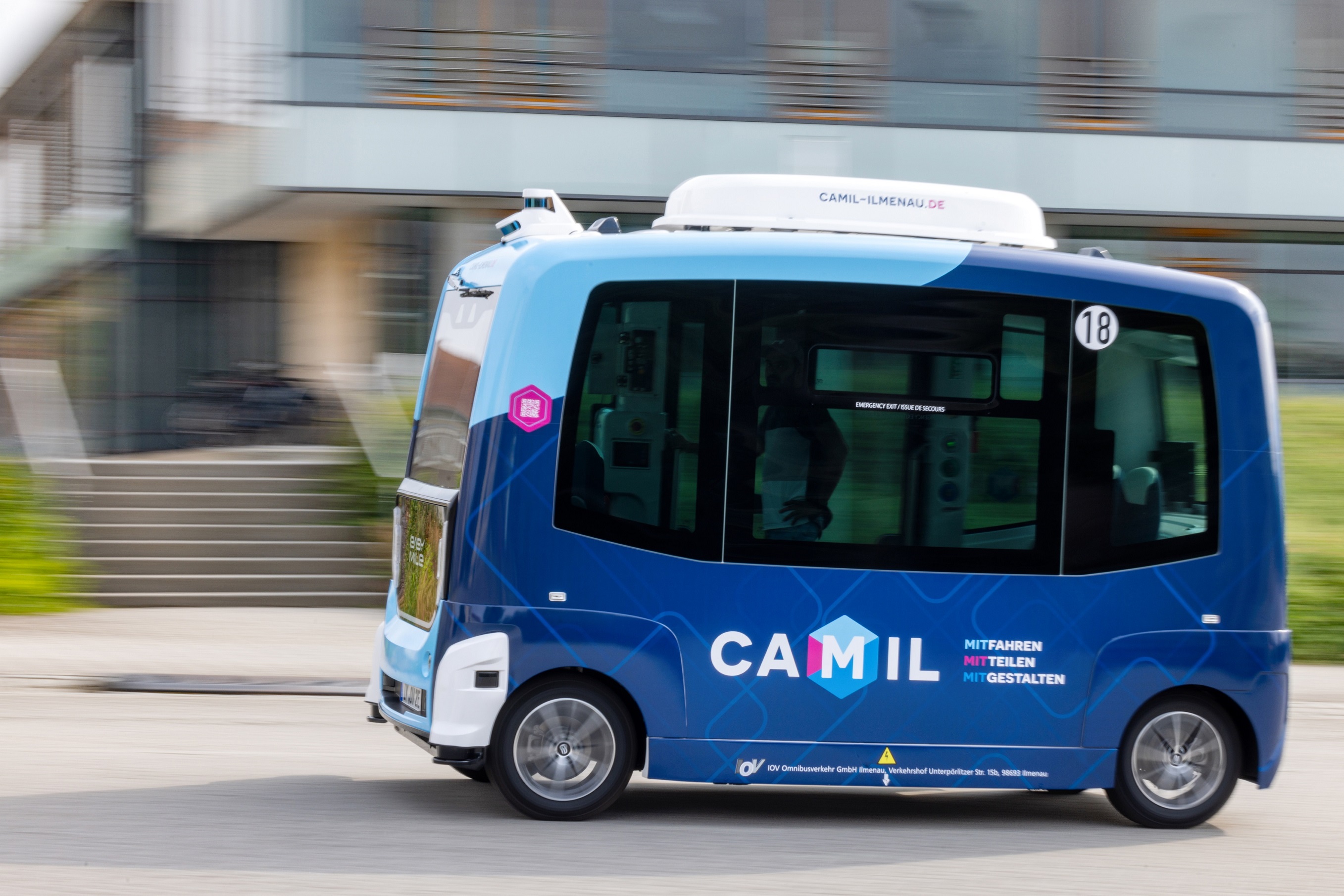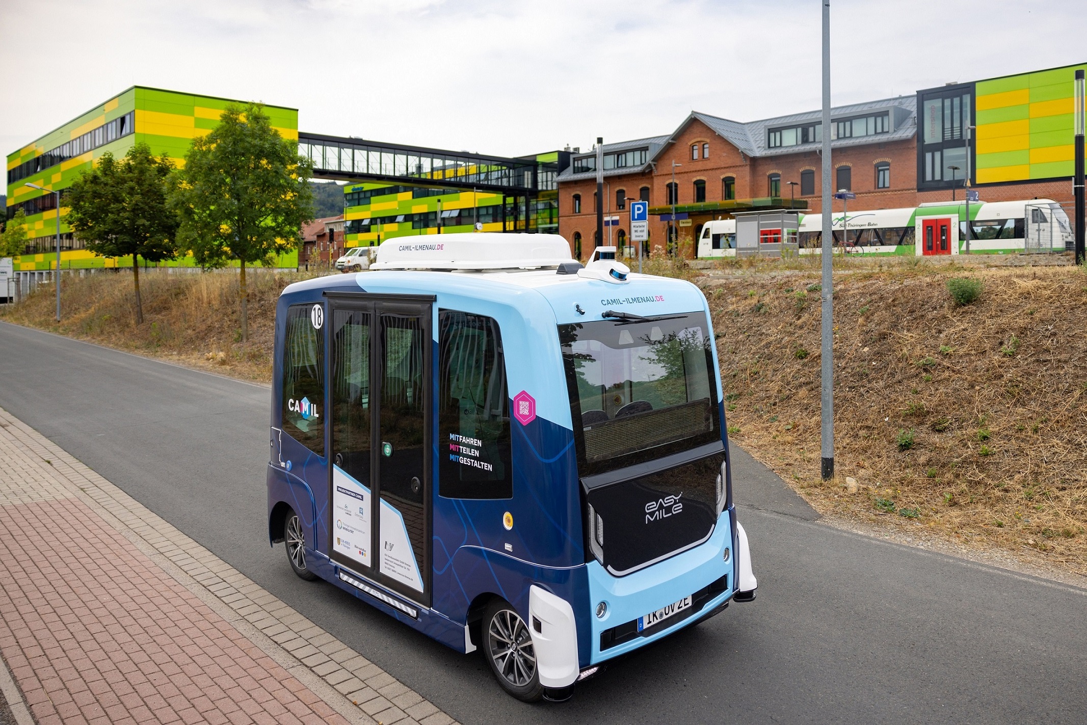 CAMIL ist der Name des neuen selbstfahrenden Busses, der in Kürze den CAMpus der Technischen Universität Ilmenau mit der Stadt ILmenau verbinden wird. Zwei automatisiert fahrende, elektrisch angetriebene Kleinbusse werden im Pendelverkehr vom Bahnhof zum wenige Kilometer entfernten Campus und zurück fahren, stündlich getaktet mit den Zügen, die die Landeshauptstadt Erfurt mit Ilmenau verbinden. Heute (15.09.2022) wurden die Busse in Anwesenheit des thüringischen Ministers für Wirtschaft, Wissenschaft und Digitale Gesellschaft Wolfgang Tiefensee der Öffentlichkeit vorgestellt.