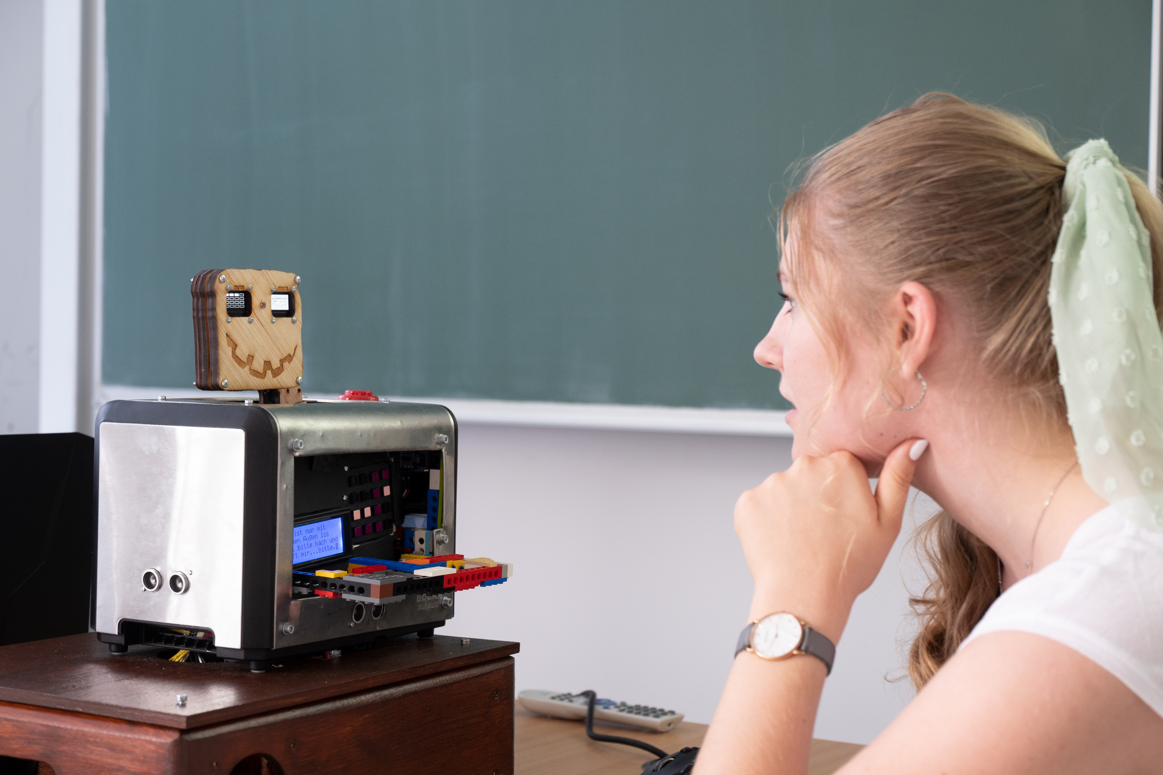 Schon von Weitem hallte lautes Lachen aus dem Vorlesungsraum durch den sommerleeren Flur. Florentine Viviane Leybold testete den „Escape Toaster“. Das Gerät spricht und zeigt Text an und es gibt ein künstliches Toastbrot mit kleinen Displays als Augen, die zum Beispiel mit einer Taschenlampe geblendet und etwas später zugehalten werden müssen. Florentine Leybold löste nach und nach alle Rätsel in dem frechen Game um den verzweifelten Keksmann, der dem Toaster wie einem Escape Room zu entrinnen sucht. Am Ende öffnet sich eine Klappe, die die Studierenden aus Lego und Servomotoren gebaut haben. „Endlich frei“ jubiliert die Computerstimme – und im Praxistest jubelte auch Florentine Leybold: „geschafft!“