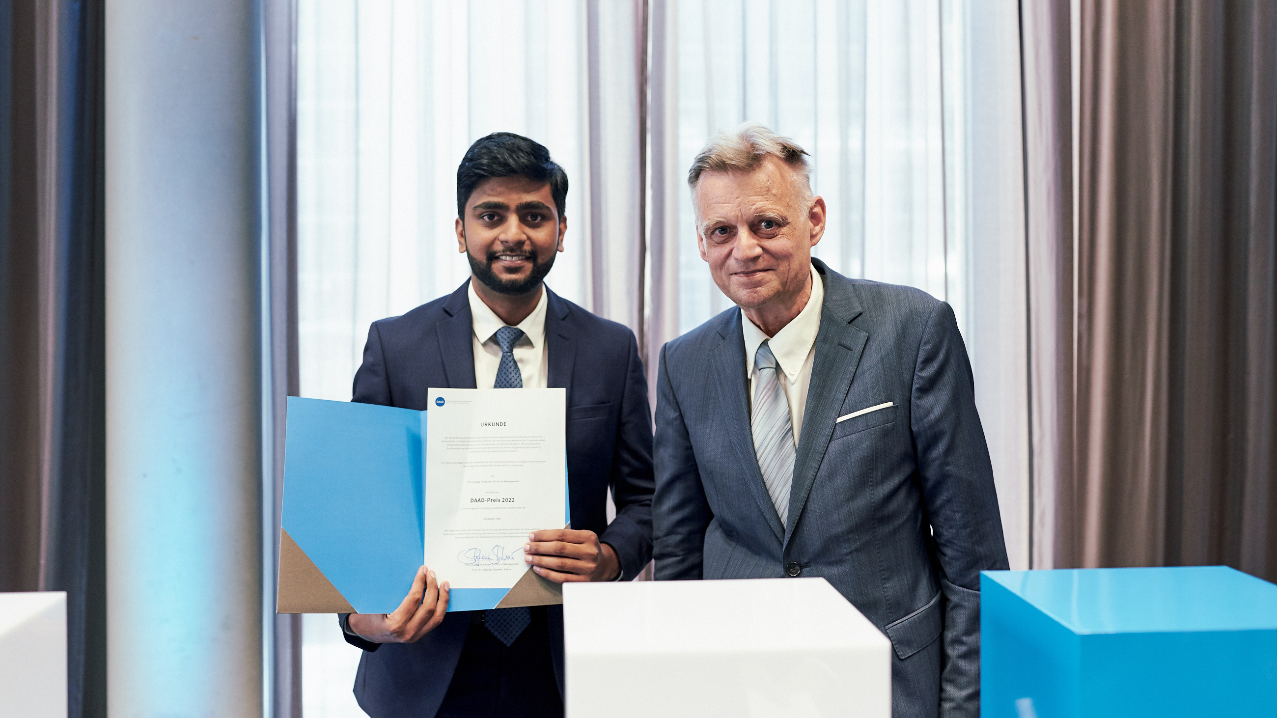 Eine außergewöhnliche Ehre wurde dem aus Indien stammenden Studenten Shubham Patil zuteil, der an der Handelshochschule Leipzig (HHL) einen Master of Business Administration absolviert. Er erhielt den Preis des Deutschen Akademischen Austauschdienstes (DAAD). Mit einer Durchschnittsnote von 1,35 zählt er zu den besten HHL-Graduierenden seines Jahrgangs. Entscheidend für die Auszeichnung war darüber hinaus sein außerordentliches interkulturelles Engagement, z.B. in der aktiven Mitarbeit in einer Studenteninitiative. Preisverleiher Frank Hoffmann, Direktor International Relations an der HHL, betonte, dass diese Ehrung in diesem Jahr deutschlandweit lediglich 200 von rund 400.000 internationalen Studierenden erhalten. Der mit 1.000 Euro dotierte DAAD-Preis wirkt nachhaltig und bereichernd auf den internationalen Austausch, indem Studierende darin unterstützt werden, ihr Masterstudium in Deutschland fortzusetzen.