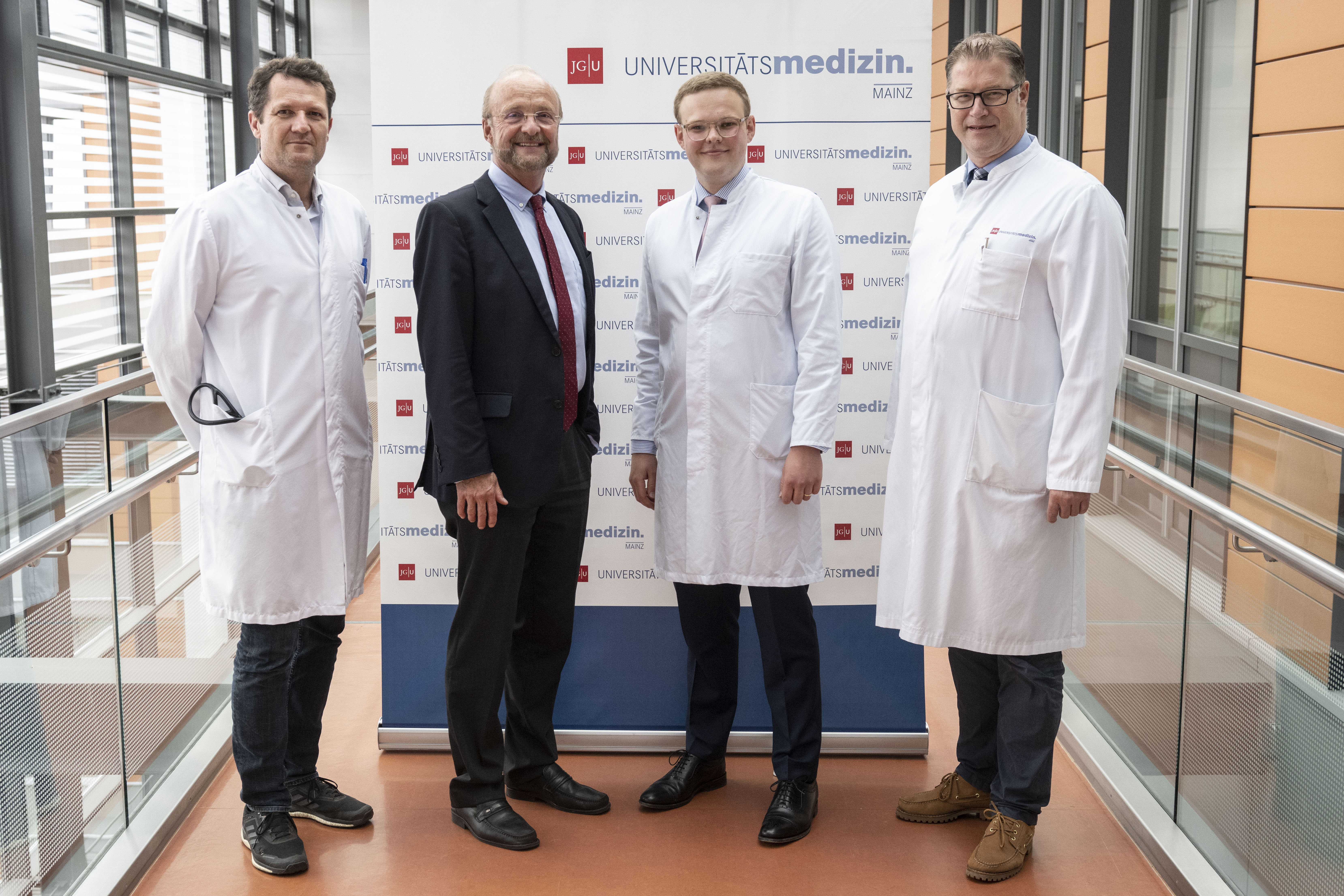Bildunterschrift: v.l.n.r. Prof. Dr. Thomas Kindler (Universitäres Centrum für Tumor-erkrankungen), Univ.-Prof. Dr. Ulrich Förstermann (Wissenschaftlicher Vorstand und Dekan), Dr. Gregor Duwe und Univ.-Prof. Dr. Axel Haferkamp (beide von Klinik und Poliklinik für Urologie und Kinderurologie) freuen sich über die BMBF-Förderung des KITTU-Projekts über 2,53 Mio. Euro.