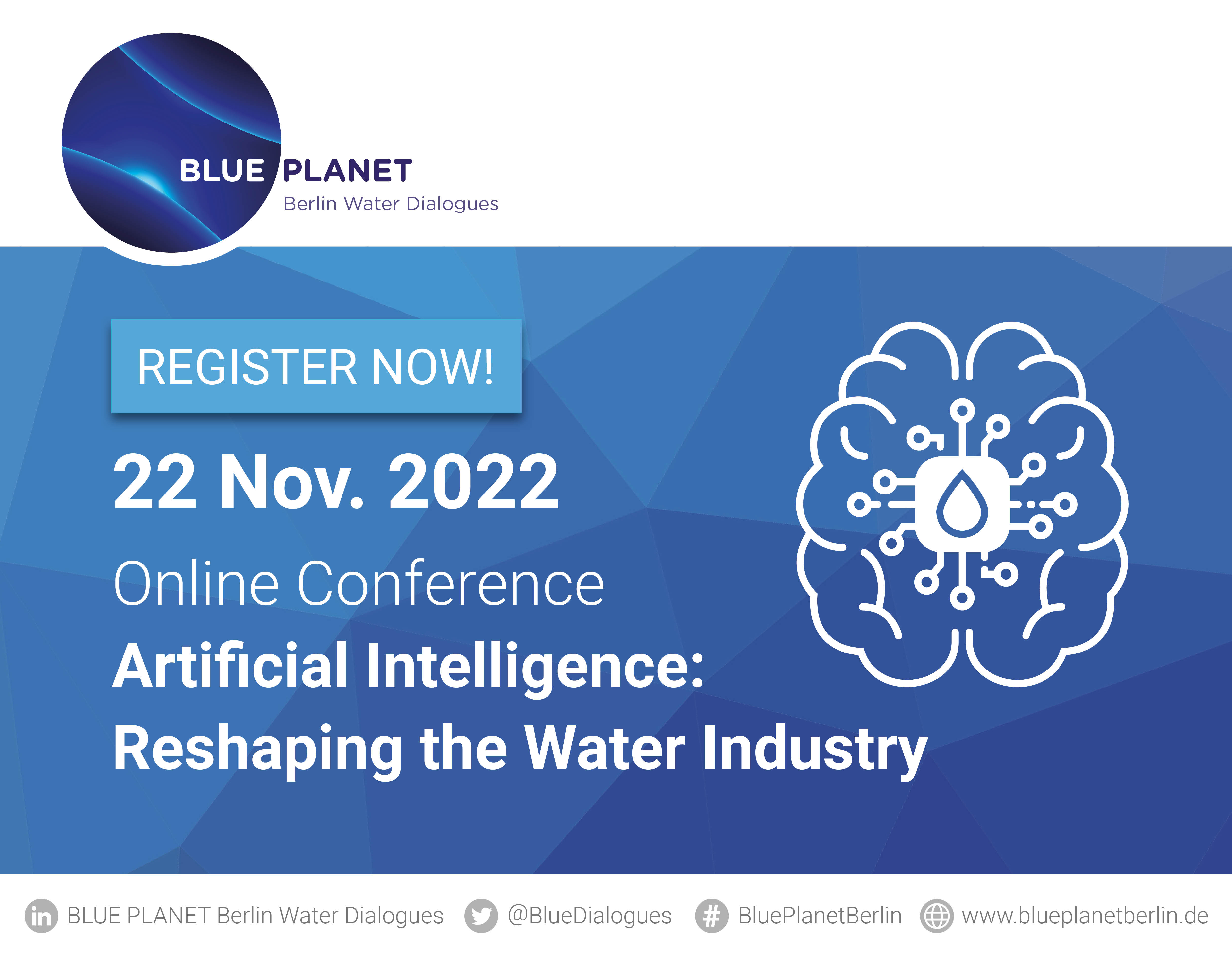 BLUE PLANET Berlin Water Dialogues is the global networking platform connecting international stakeholders from research, business, and politics in the field of innovative water management. The digital event format provides a forum to discuss approaches for future-oriented and sustainable water resource management in view of the growing global challenges posed by climate change. This year's edition on 22 November will therefore focus on the potential and challenges of applying AI in the water sector. In addition, international best practice examples from the industry will be highlighted.
