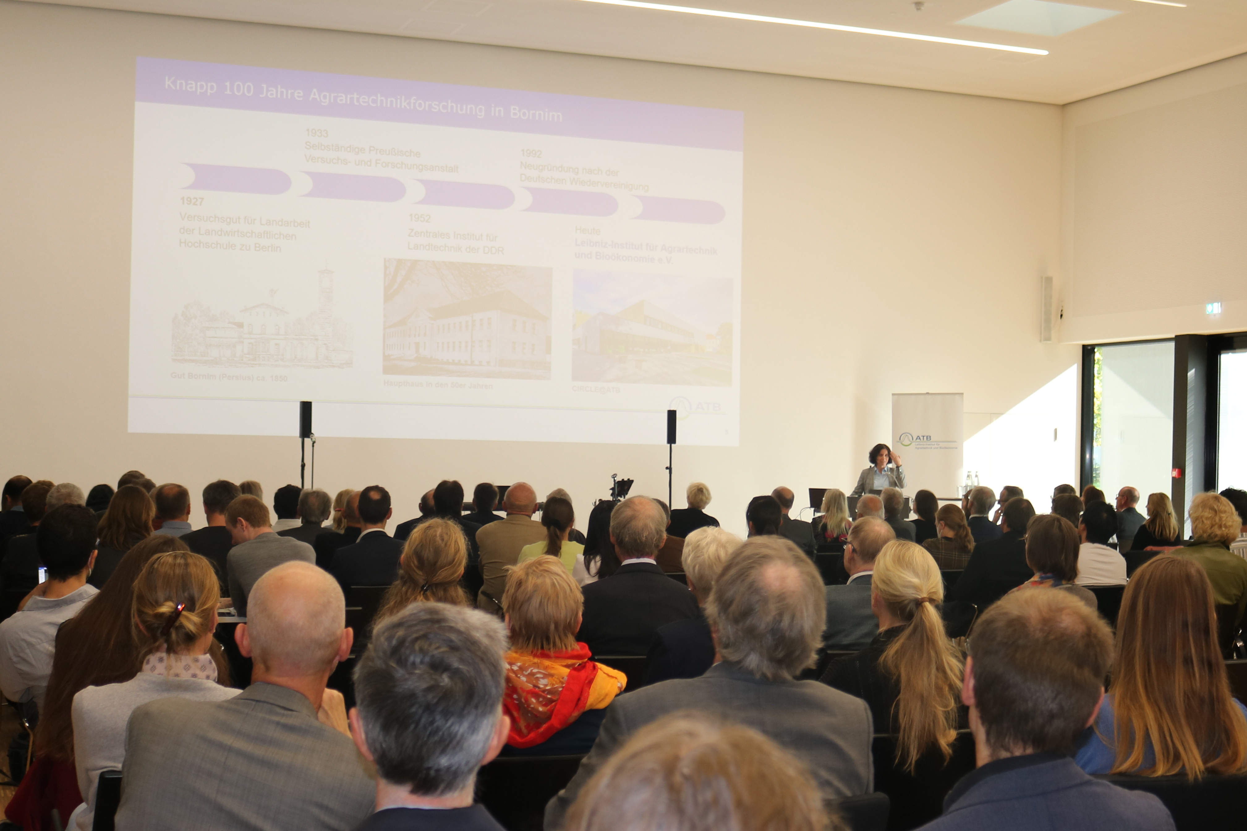 Der per Video zugeschaltete Gründungsdirektor des ATB, Dr. Gerhard Wellschof, übermittelte dem ATB seine Glückwünsche sowie Thesen für eine weiterhin erfolgreiche Zukunft, darunter den Appell: „Als Forschungsinstitut musst du laufen, um mindestens auf der Stelle zu bleiben, sonst fällst Du zurück.“ Wie Barbara Sturm erläuterte, folgt das Institut diesem Leitspruch seit der Gründung: „Das ATB versteht sich nicht ohne Grund als ein Pionier und Treiber der Bioökonomie. Bioökonomische Themen wie die Nutzung von Reststoffen für die Kreislaufwirtschaft, sei es die Verwertung zu Biogas oder die Biokonversion zu biobasierten Chemikalien, standen und stehen seit vielen Jahren neben den klassischen Themen Pflanzenbau, Tierhaltung und Nutzung von Biomasse zur Herstellung von Lebensmitteln und biobasierter Materialien auf unserer Forschungsagenda. Hier wurden Fragestellungen der Bioökonomie auf Systemebene und der Präzisionslandwirtschaft erforscht und umgesetzt, als diese Begriffe noch gar nicht besetzt waren“, so Barbara Sturm.