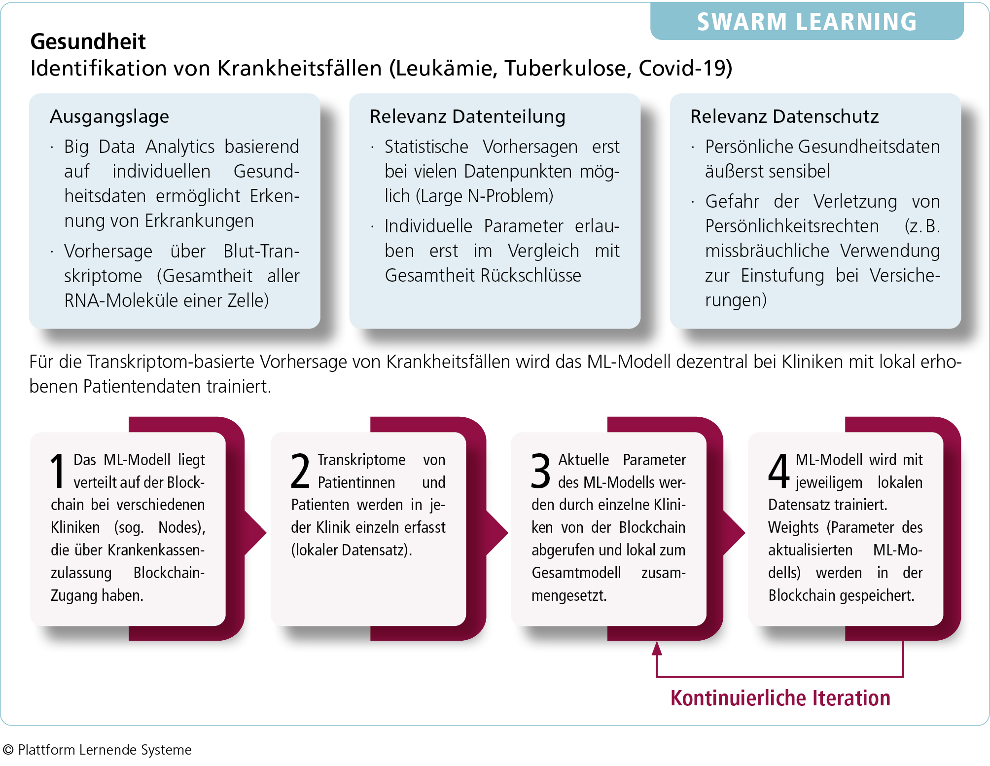 Zu den aktuellen technischen Ansätzen des verteilten maschinellen Lernens zählen das Split Learning, Federated Learning und Swarm Learning. Insbesondere KI-basierte Gesundheitslösungen, die personalisierte Patientendaten nutzen, um zum Beispiel Krankheitsfälle wie Covid-19 oder Leukämie zu erkennen, können von der Methode des verteilten maschinellen Lernens profitieren.