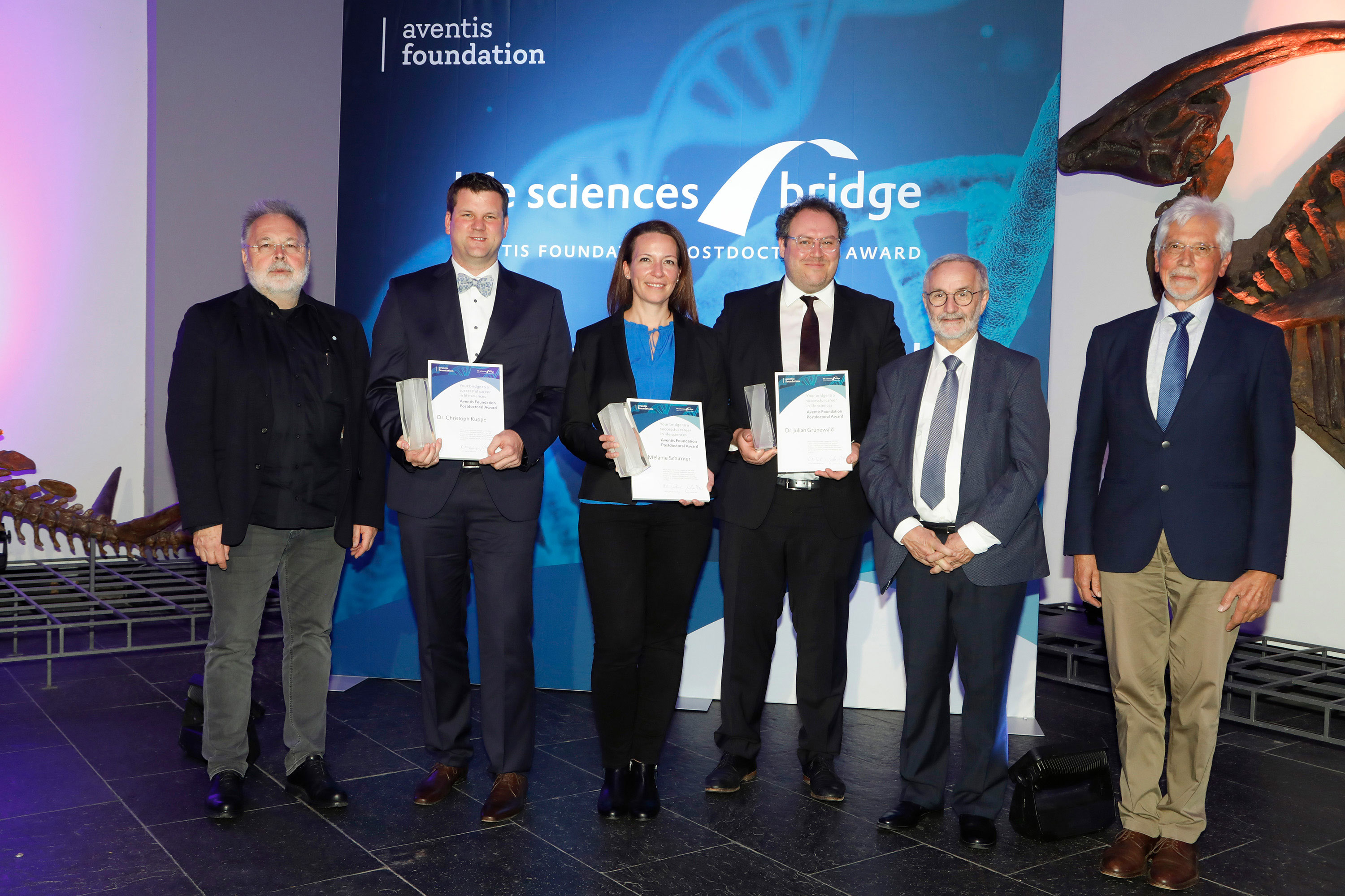 Der höchstdotierte deutsche Nachwuchspreis im Bereich der Lebenswissenschaften wurde gestern Abend im Rahmen eines Festaktes im Senckenberg-Museum in Frankfurt am Main verliehen. Mit je 100.000 Euro Preisgeld ausgezeichnet wurden eine Mathematikerin und zwei Ärzte, die in den vergangenen Jahren mit bedeutenden Leistungen in der Genforschung auf sich aufmerksam gemacht haben. Der Life Sciences Bridge Award wird die Preisträger:innen auf ihrem Weg zu einer unbefristeten Professur unterstützen.