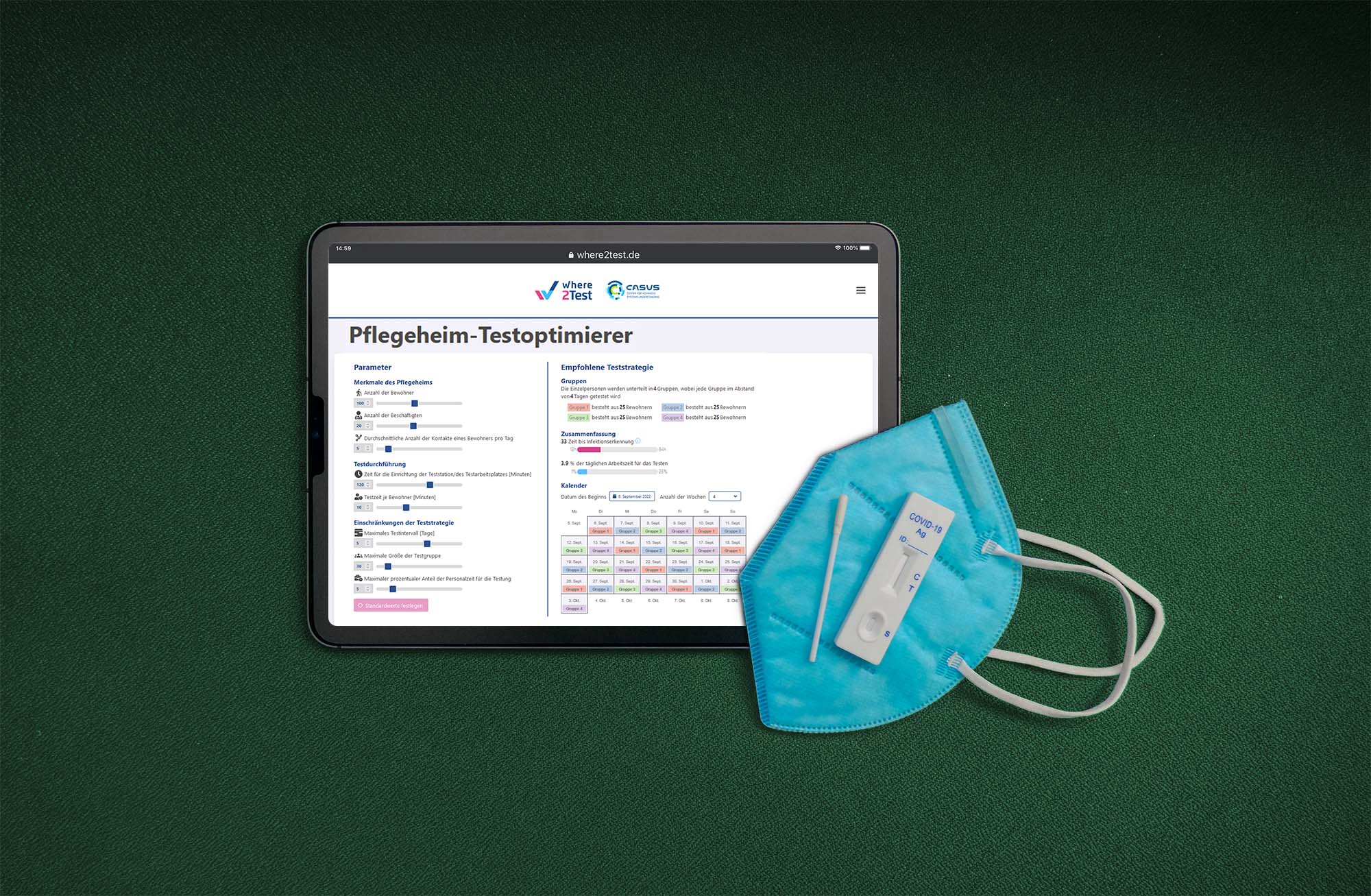 Die mittlerweile dritte Web-App des Where2Test-Teams liefert Alters- und Pflegeheimen eine wissenschaftliche Grundlage für die Entwicklung einer Teststrategie in Pandemiezeiten. Unter Berücksichtigung verschiedener Faktoren schlägt die App die tägliche Testung einzelner Gruppen der Bewohner*innen in festgelegten Intervallen von zwei bis mehreren Tagen vor. Die empfohlene Strategie zielt darauf ab, einen Krankheitsausbruch in möglichst kurzer Zeit zu entdecken, ohne das Pflegepersonal mit Tests zu überlasten.