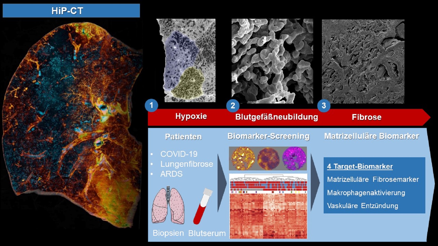 Bildunterschrift: Mithilfe der Synchrotron-basierten hierarchischen Phasenkontrast-Tomographie (HiP-CT) konnte erstmalig gezeigt werden, dass es bei schweren COVID-19-Verläufen zu einer mosaikartigen hypoxischen Minderversorgung der kleinsten funktionellen Einheit der Lunge, den Lungenlobuli, kommt. Über diese Hypoxie und Gefäßschädigung durch das SARS-CoV-2 Virus kommt es zu einer exzessiven Blutgefäßneubildung, der sogenannten intussuszeptiven Angiogenese, welche in kürzester Zeit über Entzündungsvorgänge zu einer Vernarbung und Fibrosierung des Lungengewebes führt. Um mögliche therapeutische Angriffspunkte bzw. Verlaufsbiomarker zu identifizieren, wurde Blutserum und Biopsiegewebe von Patient:innen mit verschiedenen COVID-19-Verläufen, Lungenfibrosen (IPF) und akuter Lungenschädigung (ARDS) in einem breiten Screeningansatz auf Proteomik- und Metabolomik-Ebene analysiert und validiert. Hierbei konnten vier matrizelluläre Biomarker (CD163, IGFBP7, Thrombospondin 2 und GDF15) als prädiktive Biomarker identifiziert werden, die das Fortschreiten des Vernarbungsprozesses begünstigen.