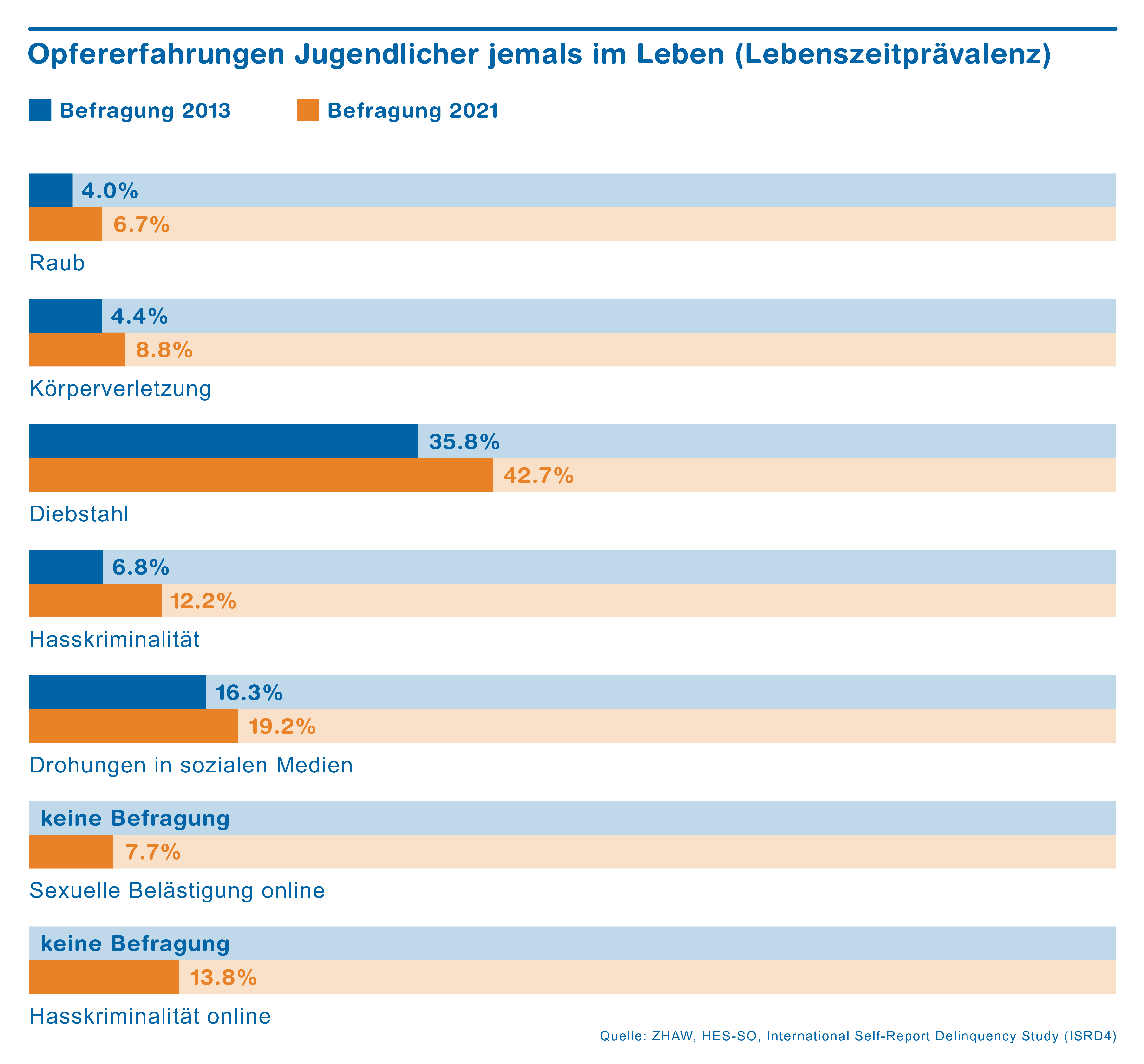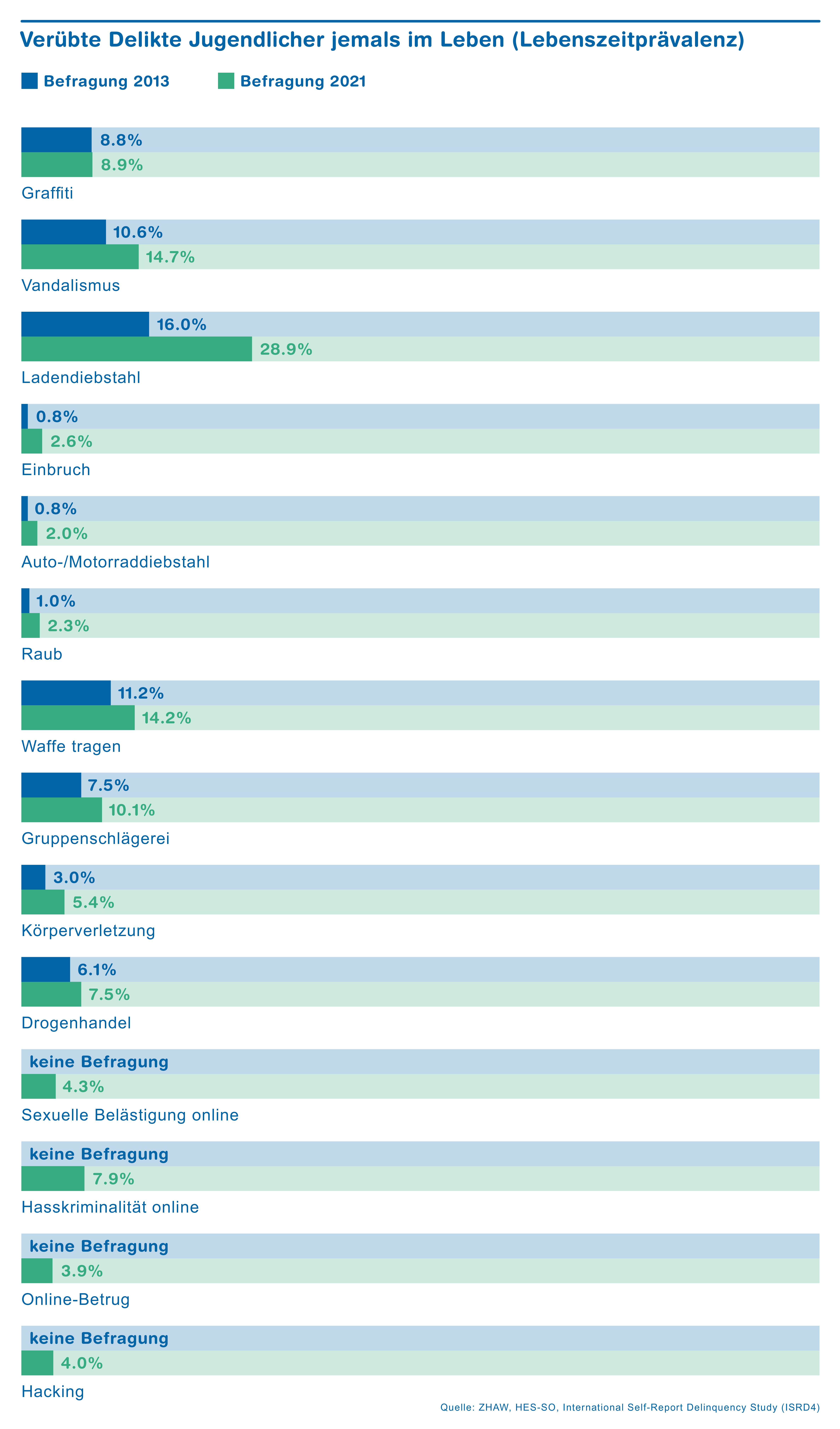 Zugenommen seit der letzten Befragung vor acht Jahren haben vor allem Delikte, die gehäuft im Jugendalter vorkommen. So gaben 29 Prozent (2013: 16 Prozent) der Befragten an, in ihrem Leben schon einmal einen Ladendiebstahl begangen zu haben. Zu Vandalismus bekannten sich 15 Prozent (2013: 11 Prozent), und über 14 Prozent (2013: 11 Prozent) trugen schon mindestens einmal eine Waffe mit sich. Zudem haben sich auch die seltenen aber schwerwiegenderen Raubdelikte verdoppelt (2013: 1 Prozent; 2021: 2,3 Prozent). Die Jugendlichen wurden 2021 erstmals auch zu online ausgeübten Taten befragt. Dabei gaben 8 Prozent an, mindestens einmal in ihrem Leben eine Hassnachricht verschickt zu haben und über 4 Prozent belästigten schon einmal jemanden im Internet sexuell.